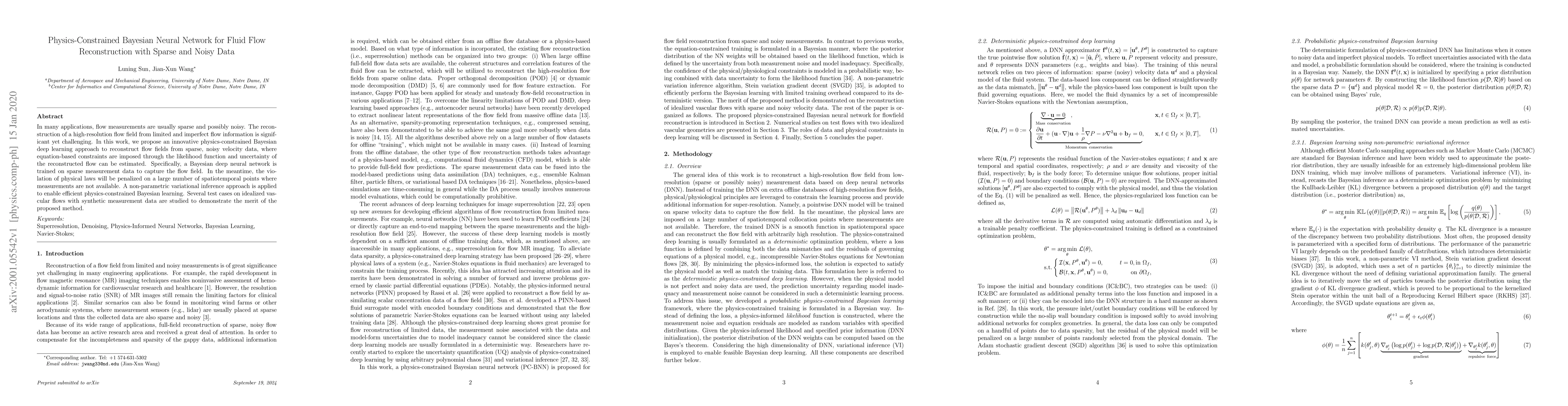This paper proposes a physics-constrained Bayesian neural network to reconstruct high-resolution fluid flow fields from sparse and noisy data. The method imposes physical law constraints through the likelihood function and estimates uncertainty, demonstrating effectiveness through tests on vascular flows.
