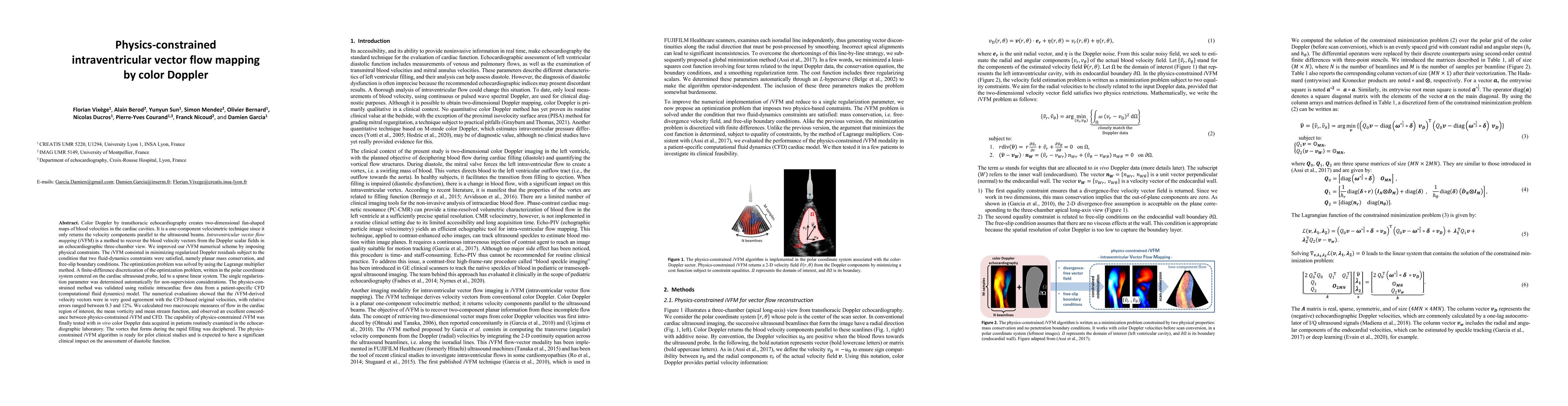 Color Doppler by transthoracic echocardiography creates 2-D fan-shaped maps of blood velocities in the cardiac cavities. It is a one-component velocimetric technique since it only returns the velocity components parallel to the ultrasound beams. Intraventricular vector flow mapping (iVFM) is a method to recover the blood velocity vectors from the Doppler scalar fields in an echocardiographic three-chamber view. We improved our iVFM numerical scheme by imposing physical constraints. The iVFM consisted in minimizing regularized Doppler residuals subject to the condition that two fluid-dynamics constraints were satisfied, namely planar mass conservation, and free-slip boundary conditions. The optimization problem was solved by using the Lagrange multiplier method. A finite-difference discretization of the optimization problem, written in the polar coordinate system centered on the cardiac ultrasound probe, led to a sparse linear system. The single regularization parameter was determined automatically for non-supervision considerations. The physics-constrained method was validated using realistic intracardiac flow data from a patient-specific CFD model. The numerical evaluations showed that the iVFM-derived velocity vectors were in very good agreement with the CFD-based original velocities, with relative errors ranged between 0.3 and 12%. We calculated two macroscopic measures of flow in the cardiac region of interest, the mean vorticity and mean stream function, and observed an excellent concordance between physics-constrained iVFM and CFD. The capability of physics-constrained iVFM was finally tested with in vivo color Doppler data acquired in patients routinely examined in the echocardiographic laboratory. The vortex that forms during the rapid filling was deciphered. The physics-constrained iVFM algorithm is ready for pilot clinical studies.