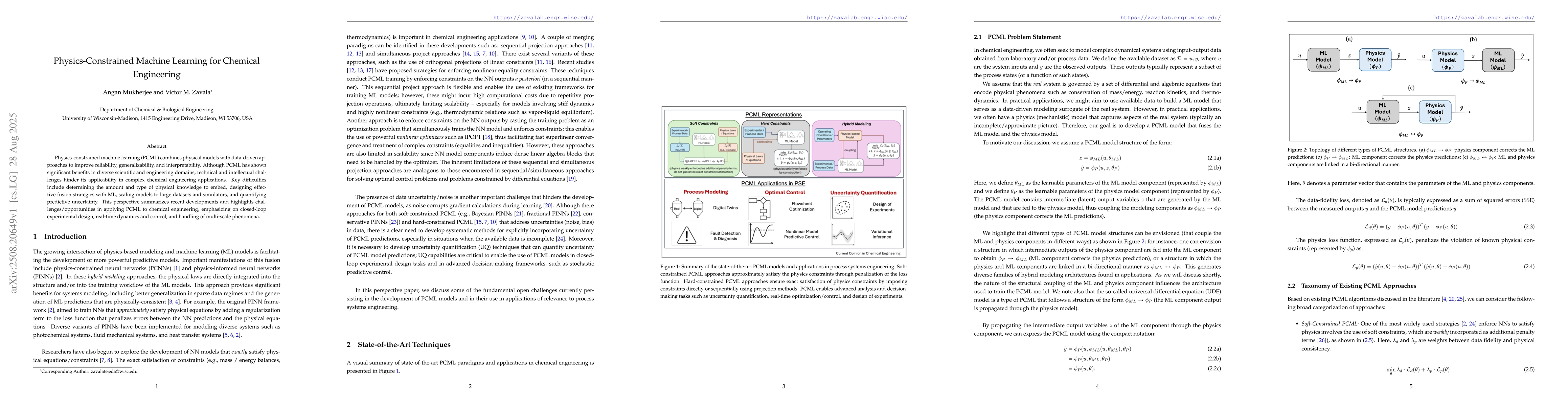 Physics-constrained machine learning (PCML) combines physical models with data-driven approaches to improve reliability, generalizability, and interpretability. Although PCML has shown significant benefits in diverse scientific and engineering domains, technical and intellectual challenges hinder its applicability in complex chemical engineering applications. Key difficulties include determining the amount and type of physical knowledge to embed, designing effective fusion strategies with ML, scaling models to large datasets and simulators, and quantifying predictive uncertainty. This perspective summarizes recent developments and highlights challenges/opportunities in applying PCML to chemical engineering, emphasizing on closed-loop experimental design, real-time dynamics and control, and handling of multi-scale phenomena.