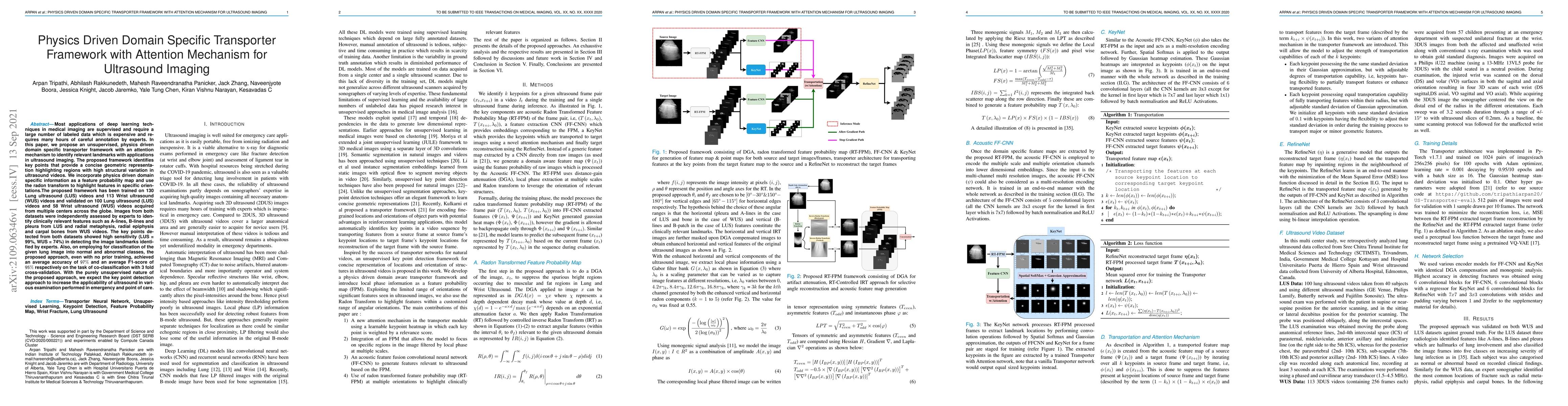 Most applications of deep learning techniques in medical imaging are supervised and require a large number of labeled data which is expensive and requires many hours of careful annotation by experts. In this paper, we propose an unsupervised, physics driven domain specific transporter framework with an attention mechanism to identify relevant key points with applications in ultrasound imaging. The proposed framework identifies key points that provide a concise geometric representation highlighting regions with high structural variation in ultrasound videos. We incorporate physics driven domain specific information as a feature probability map and use the radon transform to highlight features in specific orientations. The proposed framework has been trained on130 Lung ultrasound (LUS) videos and 113 Wrist ultrasound (WUS) videos and validated on 100 Lung ultrasound (LUS) videos and 58 Wrist ultrasound (WUS) videos acquired from multiple centers across the globe. Images from both datasets were independently assessed by experts to identify clinically relevant features such as A-lines, B-lines and pleura from LUS and radial metaphysis, radial epiphysis and carpal bones from WUS videos. The key points detected from both datasets showed high sensitivity (LUS = 99\% , WUS = 74\%) in detecting the image landmarks identified by experts. Also, on employing for classification of the given lung image into normal and abnormal classes, the proposed approach, even with no prior training, achieved an average accuracy of 97\% and an average F1-score of 95\% respectively on the task of co-classification with 3 fold cross-validation. With the purely unsupervised nature of the proposed approach, we expect the key point detection approach to increase the applicability of ultrasound in various examination performed in emergency and point of care.