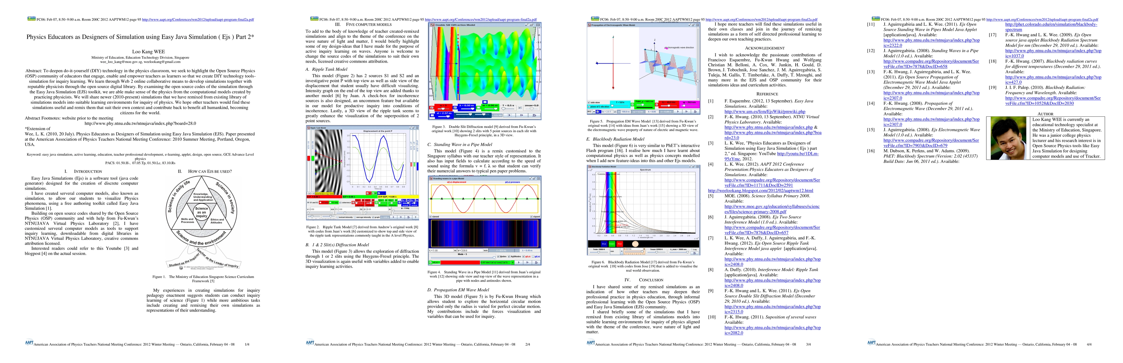 To deepen do-it-yourself (DIY) technology in the physics classroom, we seek to highlight the Open Source Physics (OSP) community of educators that engage, enable and empower teachers as learners so that we create DIY technology tools-simulation for inquiry learning. We learn through Web 2 online collaborative means to develop simulations together with reputable physicists through the open source digital library. By examining the open source codes of the simulation through the Easy Java Simulation (EJS) toolkit, we are able make sense of the physics from the computational models created by practicing physicists. We will share newer (2010-present) simulations that we have remixed from existing library of simulations models into suitable learning environments for inquiry of physics. We hope other teachers would find these simulations useful and remix them that suit their own context and contribute back to benefit all humankind, becoming citizens for the world. Abstract Footnotes: website prior to the meeting http://www.phy.ntnu.edu.tw/ntnujava/index.php?board=28.0 *Extension of Wee, L. K. (2010, 20 July). Physics Educators as Designers of Simulation using Easy Java Simulation (EJS). Paper presented at the American Association of Physics Teachers National Meeting Conference: 2010 Summer Meeting, Portland, Oregon, USA.