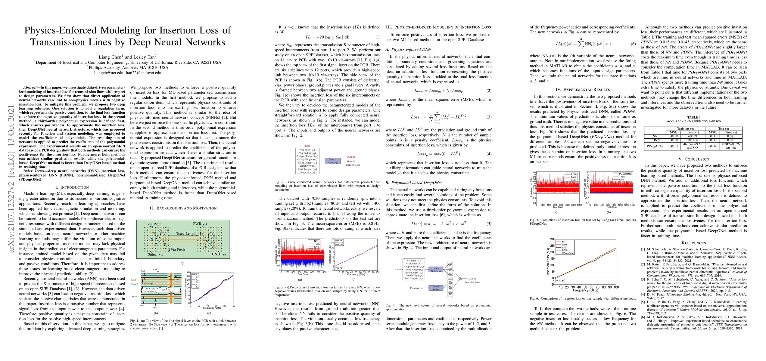 In this paper, we investigate data-driven parameterized modeling of insertion loss for transmission lines with respect to design parameters. We first show that direct application of neural networks can lead to non-physics models with negative insertion loss. To mitigate this problem, we propose two deep learning solutions. One solution is to add a regulation term, which represents the passive condition, to the final loss function to enforce the negative quantity of insertion loss. In the second method, a third-order polynomial expression is defined first, which ensures positiveness, to approximate the insertion loss, then DeepONet neural network structure, which was proposed recently for function and system modeling, was employed to model the coefficients of polynomials. The resulting neural network is applied to predict the coefficients of the polynomial expression. The experimental results on an open-sourced SI/PI database of a PCB design show that both methods can ensure the positiveness for the insertion loss. Furthermore, both methods can achieve similar prediction results, while the polynomial-based DeepONet method is faster than DeepONet based method in training time.