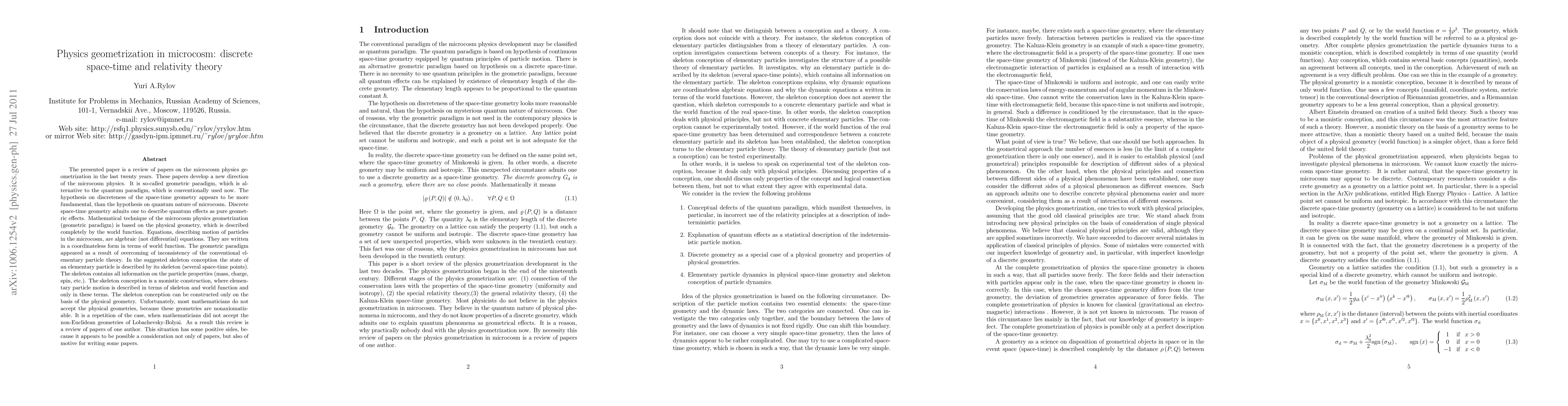 The presented paper is a review of papers on the microcosm physics geometrization in the last twenty years. These papers develop a new direction of the microcosm physics. It is so-called geometric paradigm, which is alternative to the quantum paradigm, which is conventionally used now. The hypothesis on discreteness of the space-time geometry appears to be more fundamental, than the hypothesis on quantum nature of microcosm. Discrete space-time geometry admits one to describe quantum effects as pure geometric effects. Mathematical technique of the microcosm physics geometrization (geometric paradigm) is based on the physical geometry, which is described completely by the world function. Equations, describing motion of particles in the microcosm, are algebraic (not differential) equations. They are written in a coordinateless form in terms of world function. The geometric paradigm appeared as a result of overcoming of inconsistency of the conventional elementary particle theory. In the suggested skeleton conception the state of an elementary particle is described by its skeleton (several space-time points). The skeleton contains all information on the particle properties (mass, charge, spin, etc.). The skeleton conception is a monistic construction, where elementary particle motion is described in terms of skeleton and world function and only in these terms. The skeleton conception can be constructed only on the basis of the physical geometry. Unfortunately, most mathematicians do not accept the physical geometries, because these geometries are nonaxiomatizable. It is a repetition of the case, when mathematicians did not accept the non-Euclidean geometries of Lobachevsky-Bolyai. As a result this review is a review of papers of one author.