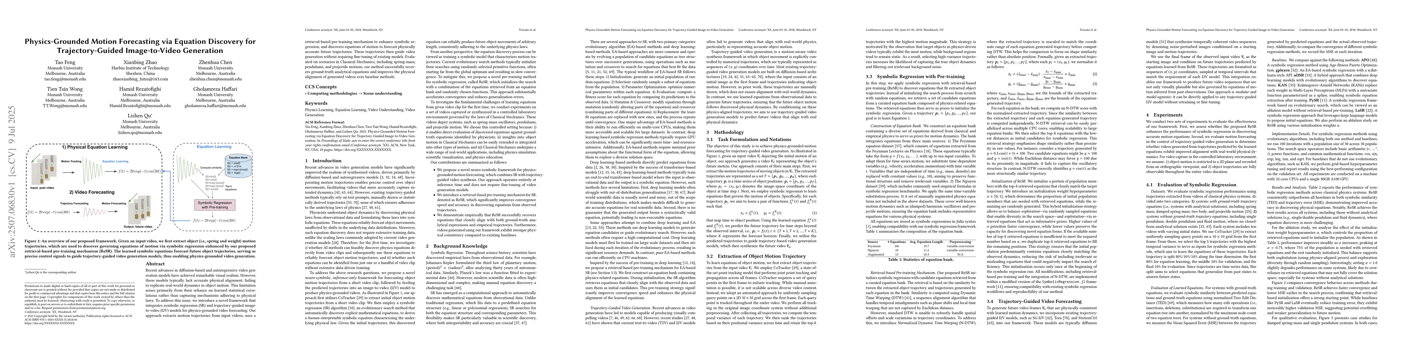 Recent advances in diffusion-based and autoregressive video generation models have achieved remarkable visual realism. However, these models typically lack accurate physical alignment, failing to replicate real-world dynamics in object motion. This limitation arises primarily from their reliance on learned statistical correlations rather than capturing mechanisms adhering to physical laws. To address this issue, we introduce a novel framework that integrates symbolic regression (SR) and trajectory-guided image-to-video (I2V) models for physics-grounded video forecasting. Our approach extracts motion trajectories from input videos, uses a retrieval-based pre-training mechanism to enhance symbolic regression, and discovers equations of motion to forecast physically accurate future trajectories. These trajectories then guide video generation without requiring fine-tuning of existing models. Evaluated on scenarios in Classical Mechanics, including spring-mass, pendulums, and projectile motions, our method successfully recovers ground-truth analytical equations and improves the physical alignment of generated videos over baseline methods.