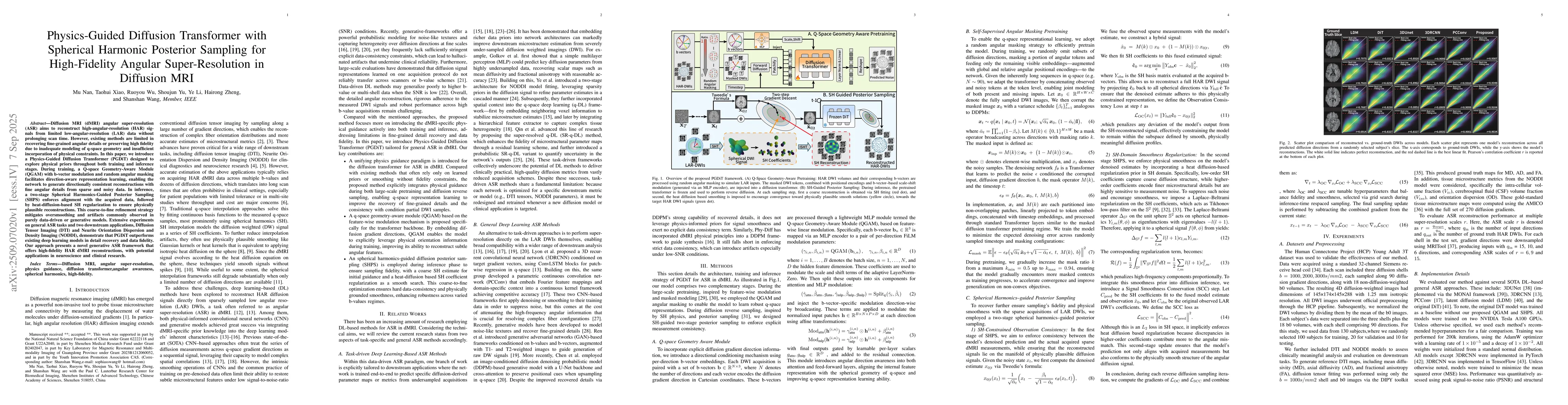 Diffusion MRI (dMRI) angular super-resolution (ASR) aims to reconstruct high-angular-resolution (HAR) signals from limited low-angular-resolution (LAR) data without prolonging scan time. However, existing methods are limited in recovering fine-grained angular details or preserving high fidelity due to inadequate modeling of q-space geometry and insufficient incorporation of physical constraints. In this paper, we introduce a Physics-Guided Diffusion Transformer (PGDiT) designed to explore physical priors throughout both training and inference stages. During training, a Q-space Geometry-Aware Module (QGAM) with b-vector modulation and random angular masking facilitates direction-aware representation learning, enabling the network to generate directionally consistent reconstructions with fine angular details from sparse and noisy data. In inference, a two-stage Spherical Harmonics-Guided Posterior Sampling (SHPS) enforces alignment with the acquired data, followed by heat-diffusion-based SH regularization to ensure physically plausible reconstructions. This coarse-to-fine refinement strategy mitigates oversmoothing and artifacts commonly observed in purely data-driven or generative models. Extensive experiments on general ASR tasks and two downstream applications, Diffusion Tensor Imaging (DTI) and Neurite Orientation Dispersion and Density Imaging (NODDI), demonstrate that PGDiT outperforms existing deep learning models in detail recovery and data fidelity. Our approach presents a novel generative ASR framework that offers high-fidelity HAR dMRI reconstructions, with potential applications in neuroscience and clinical research.
