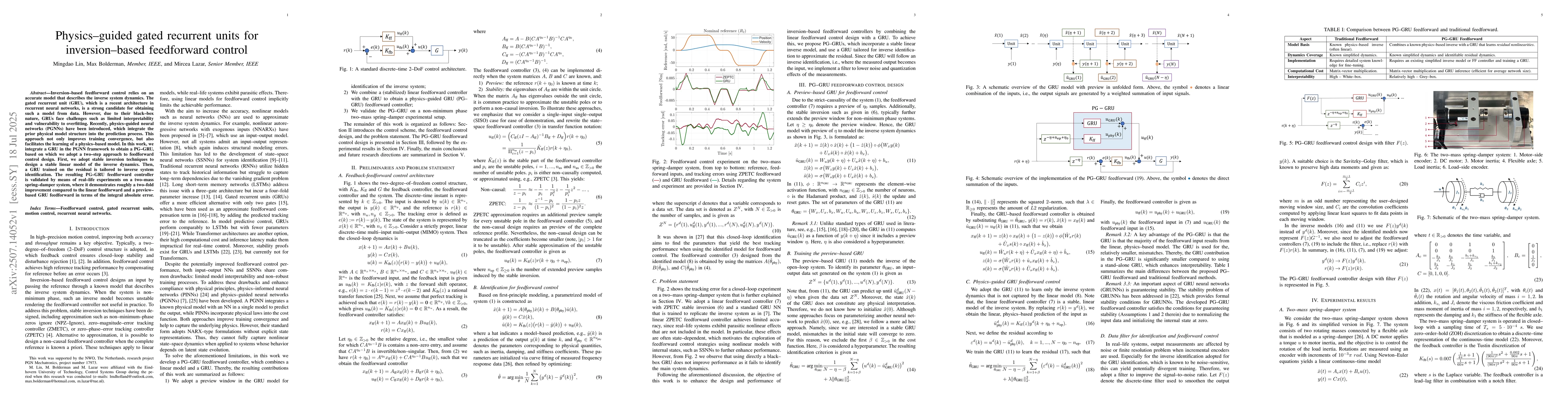 Inversion-based feedforward control relies on an accurate model that describes the inverse system dynamics. The gated recurrent unit (GRU), which is a recent architecture in recurrent neural networks, is a strong candidate for obtaining such a model from data. However, due to their black-box nature, GRUs face challenges such as limited interpretability and vulnerability to overfitting. Recently, physics-guided neural networks (PGNNs) have been introduced, which integrate the prior physical model structure into the prediction process. This approach not only improves training convergence, but also facilitates the learning of a physics-based model. In this work, we integrate a GRU in the PGNN framework to obtain a PG-GRU, based on which we adopt a two-step approach to feedforward control design. First, we adopt stable inversion techniques to design a stable linear model of the inverse dynamics. Then, a GRU trained on the residual is tailored to inverse system identification. The resulting PG-GRU feedforward controller is validated by means of real-life experiments on a two-mass spring-damper system, where it demonstrates roughly a two-fold improvement compared to the linear feedforward and a preview-based GRU feedforward in terms of the integral absolute error.