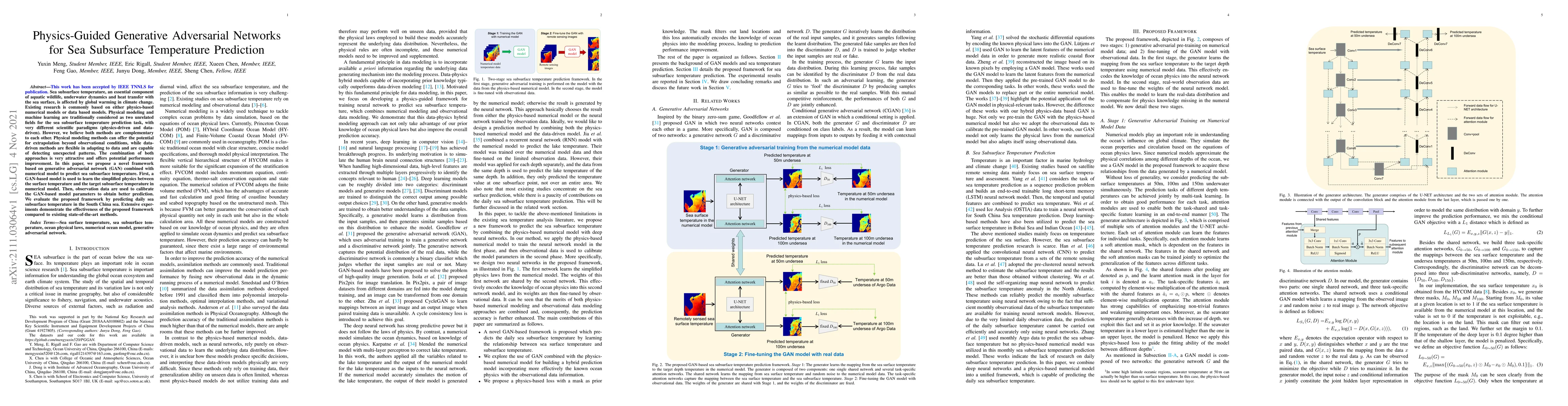 This paper proposes a novel hybrid framework using physics-guided generative adversarial networks (GANs) to predict sea subsurface temperatures, combining the strengths of physics-based modeling and data-driven machine learning for improved performance. The framework uses GANs to learn simplified physics and calibrates them with observational data for better predictions, demonstrating superior results in daily temperature predictions in the South China Sea.