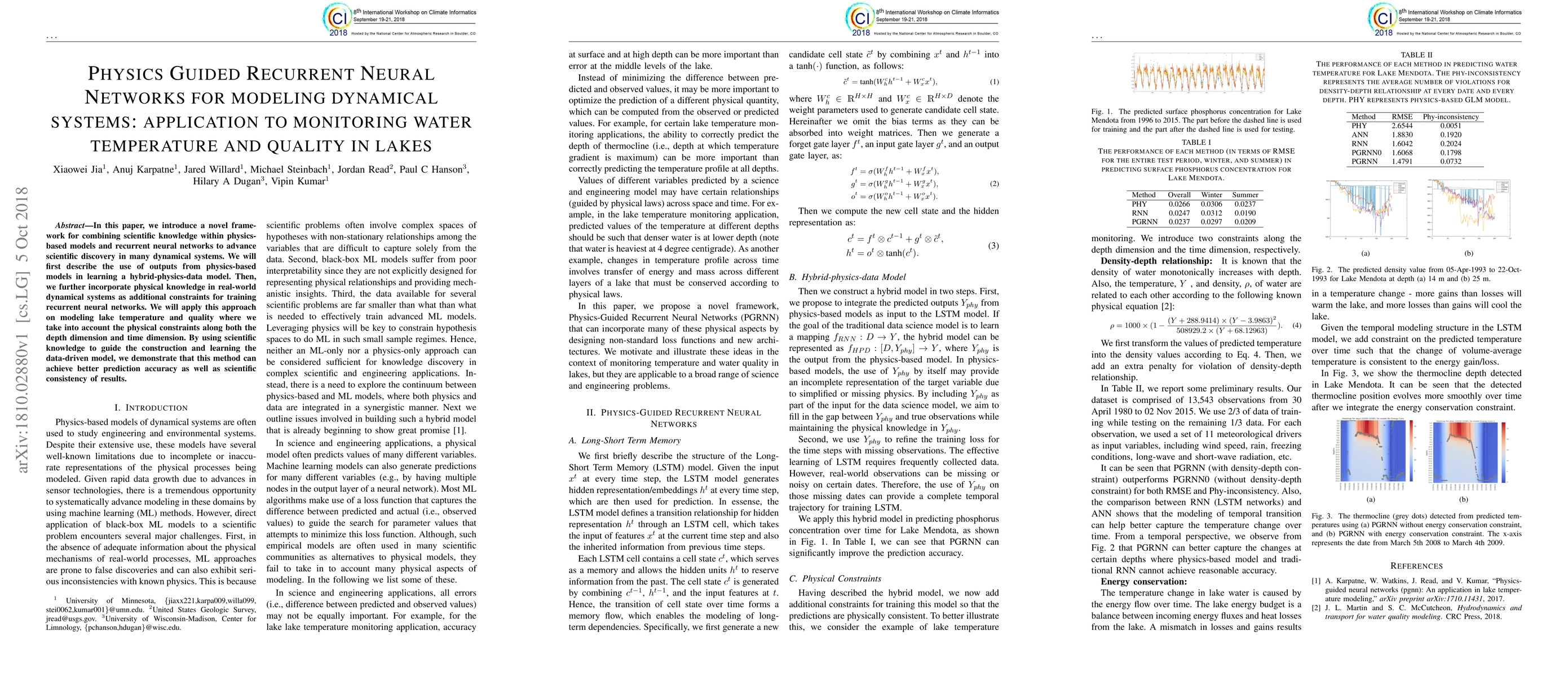 This paper proposes a novel framework that integrates physics-based models with recurrent neural networks to enhance modeling of dynamical systems. The approach uses physical constraints to guide neural network training, achieving better prediction accuracy and scientific consistency, demonstrated in the context of modeling lake temperature and water quality.