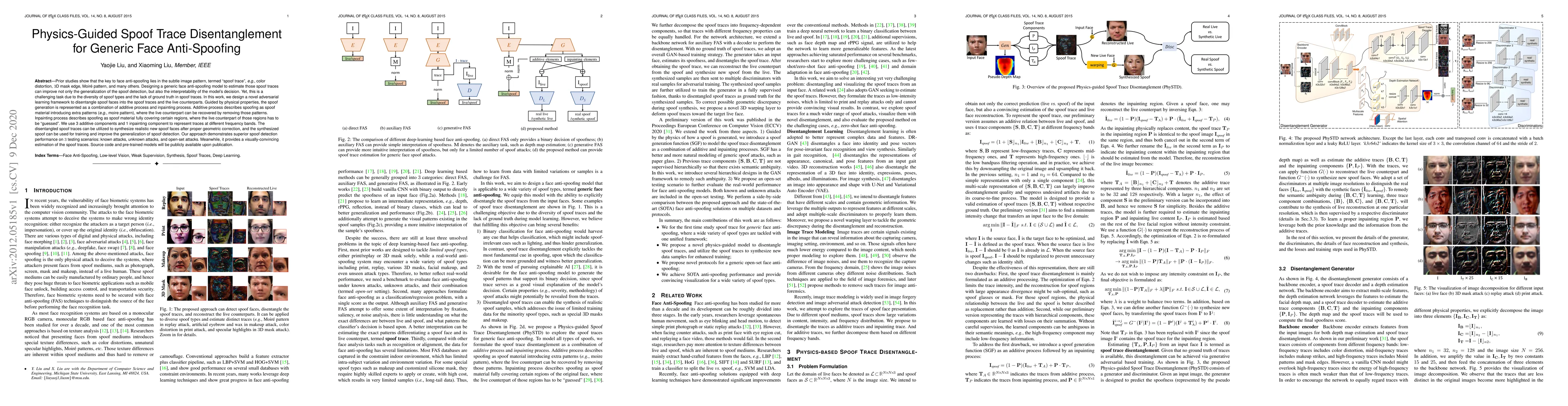 This paper proposes a physics-guided adversarial learning framework for disentangling spoof traces in face anti-spoofing, representing spoofing as additive and inpainting processes. The method improves generalization and interpretability of spoof detection, demonstrating superior performance across known, unknown, and open-set attacks.