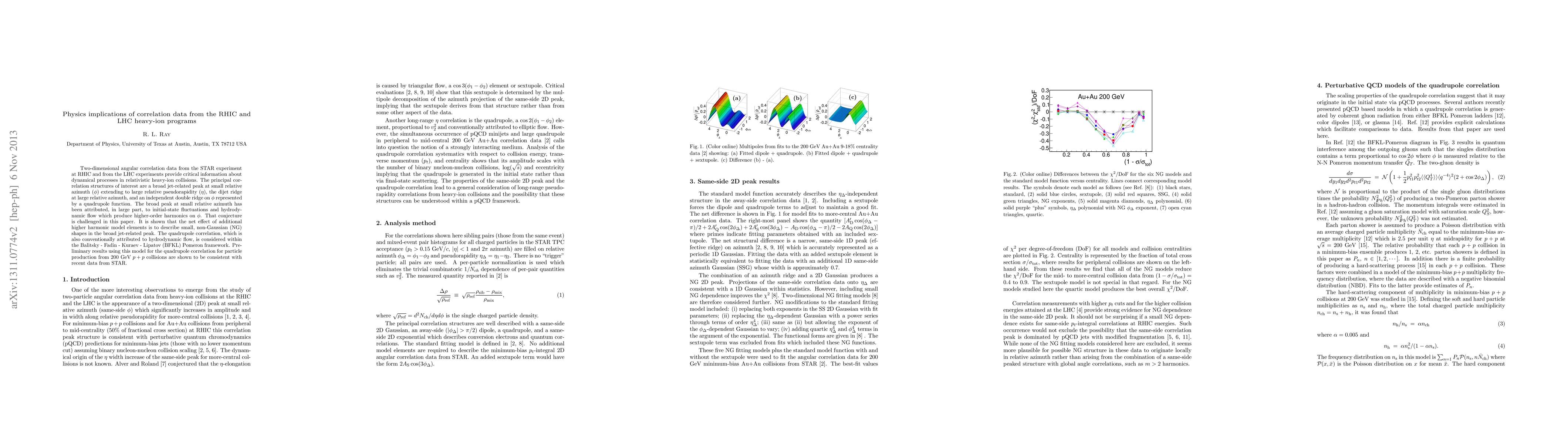 Two-dimensional angular correlation data from the STAR experiment at RHIC and from the LHC experiments provide critical information about dynamical processes in relativistic heavy-ion collisions. The principal correlation structures of interest are a broad jet-related peak at small relative azimuth ($\phi$) extending to large relative pseudorapidity ($\eta$), the dijet ridge at large relative azimuth, and an independent double ridge on $\phi$ represented by a quadrupole function. The broad peak at small relative azimuth has been attributed, in large part, to initial-state fluctuations and hydrodynamic flow which produce higher-order harmonics on $\phi$. That conjecture is challenged in this paper. It is shown that the net effect of additional higher harmonic model elements is to describe small, non-Gaussian (NG) shapes in the broad jet-related peak. The quadrupole correlation, which is also conventionally attributed to hydrodynamic flow, is considered within the Balitsky - Fadin - Kuraev - Lipatov (BFKL) Pomeron framework. Preliminary results using this model for the quadrupole correlation for particle production from 200 GeV $p+p$ collisions are shown to be consistent with recent data from STAR.