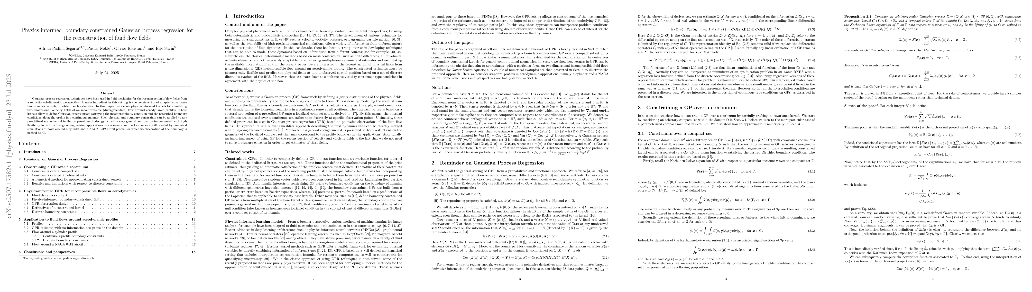 Gaussian process regression techniques have been used in fluid mechanics for the reconstruction of flow fields from a reduction-of-dimension perspective. A main ingredient in this setting is the construction of adapted covariance functions, or kernels, to obtain such estimates. In this paper, we derive physics-informed kernels for simulating two-dimensional velocity fields of an incompressible (divergence-free) flow around aerodynamic profiles. These kernels allow to define Gaussian process priors satisfying the incompressibility condition and the prescribed boundary conditions along the profile in a continuous manner. Such physical and boundary constraints can be applied to any pre-defined scalar kernel in the proposed methodology, which is very general and can be implemented with high flexibility for a broad range of engineering applications. Its relevance and performances are illustrated by numerical simulations of flows around a cylinder and a NACA 0412 airfoil profile, for which no observation at the boundary is needed at all.