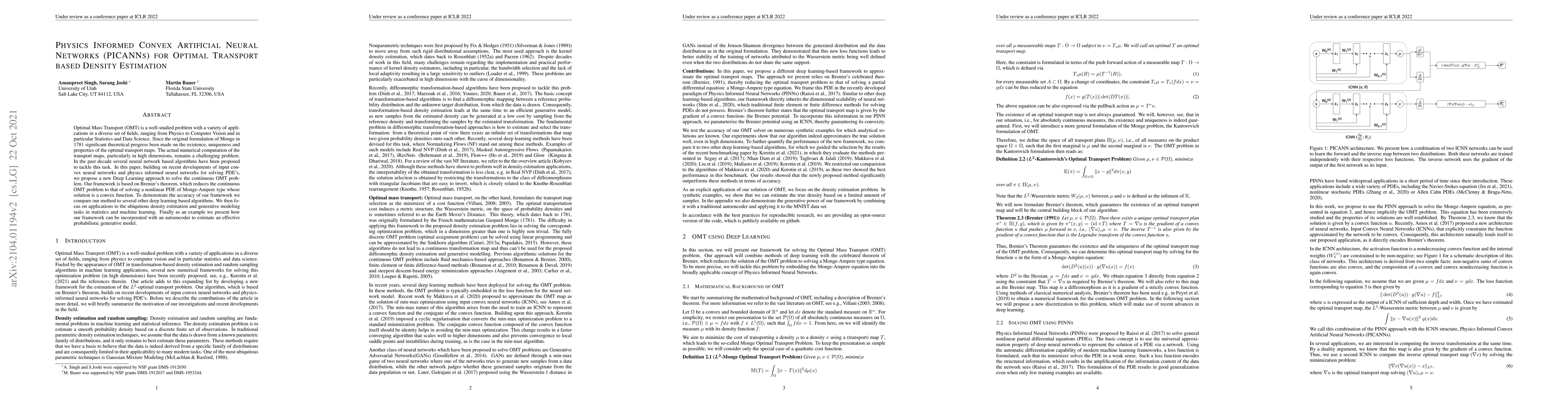 Optimal Mass Transport (OMT) is a well studied problem with a variety of applications in a diverse set of fields ranging from Physics to Computer Vision and in particular Statistics and Data Science. Since the original formulation of Monge in 1781 significant theoretical progress been made on the existence, uniqueness and properties of the optimal transport maps. The actual numerical computation of the transport maps, particularly in high dimensions, remains a challenging problem. By Brenier's theorem, the continuous OMT problem can be reduced to that of solving a non-linear PDE of Monge-Ampere type whose solution is a convex function. In this paper, building on recent developments of input convex neural networks and physics informed neural networks for solving PDE's, we propose a Deep Learning approach to solve the continuous OMT problem. To demonstrate the versatility of our framework we focus on the ubiquitous density estimation and generative modeling tasks in statistics and machine learning. Finally as an example we show how our framework can be incorporated with an autoencoder to estimate an effective probabilistic generative model.