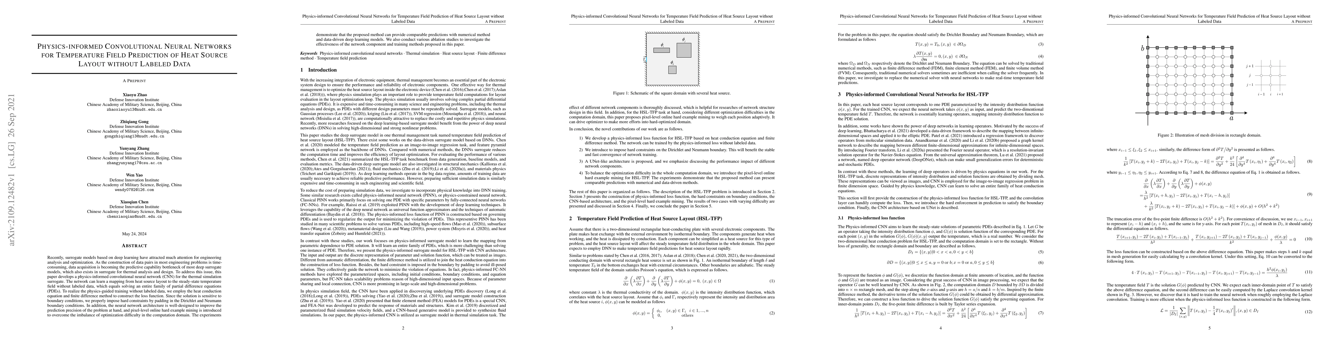 This paper proposes a physics-informed convolutional neural network (CNN) to predict temperature fields from heat source layouts without requiring labeled data. The method leverages the heat conduction equation and finite difference methods to guide the training, achieving comparable predictions to numerical methods and data-driven models.