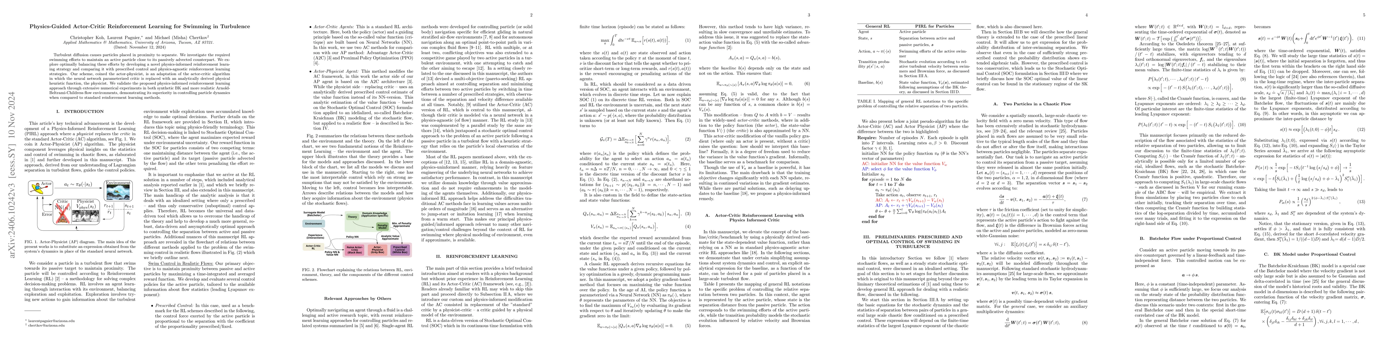 This paper investigates optimal swimming strategies for maintaining proximity between actively swimming and passively advected particles in turbulent environments. It introduces a Physics-Informed Reinforcement Learning (PIRL) approach, termed Actor-Physicist, which uses an analytically derived physical heuristic instead of a neural network critic, and compares it to control-based and standard reinforcement learning methods.