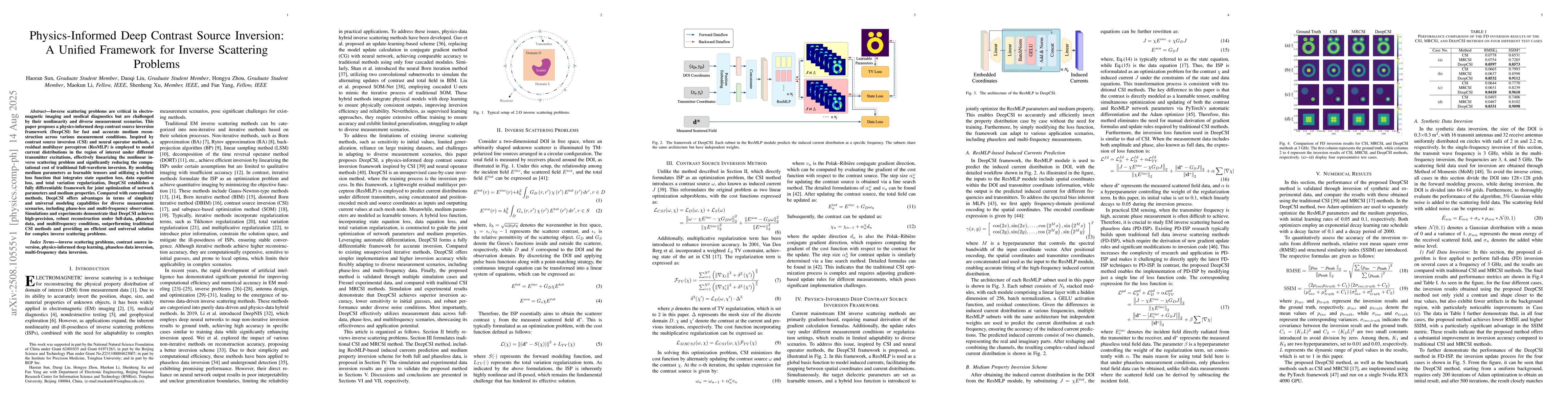 Inverse scattering problems are critical in electromagnetic imaging and medical diagnostics but are challenged by their nonlinearity and diverse measurement scenarios. This paper proposes a physics-informed deep contrast source inversion framework (DeepCSI) for fast and accurate medium reconstruction across various measurement conditions. Inspired by contrast source inversion (CSI) and neural operator methods, a residual multilayer perceptron (ResMLP) is employed to model current distributions in the region of interest under different transmitter excitations, effectively linearizing the nonlinear inverse scattering problem and significantly reducing the computational cost of traditional full-waveform inversion. By modeling medium parameters as learnable tensors and utilizing a hybrid loss function that integrates state equation loss, data equation loss, and total variation regularization, DeepCSI establishes a fully differentiable framework for joint optimization of network parameters and medium properties. Compared with conventional methods, DeepCSI offers advantages in terms of simplicity and universal modeling capabilities for diverse measurement scenarios, including phase-less and multi-frequency observation. Simulations and experiments demonstrate that DeepCSI achieves high-precision, robust reconstruction under full-data, phaseless data, and multifrequency conditions, outperforming traditional CSI methods and providing an efficient and universal solution for complex inverse scattering problems.