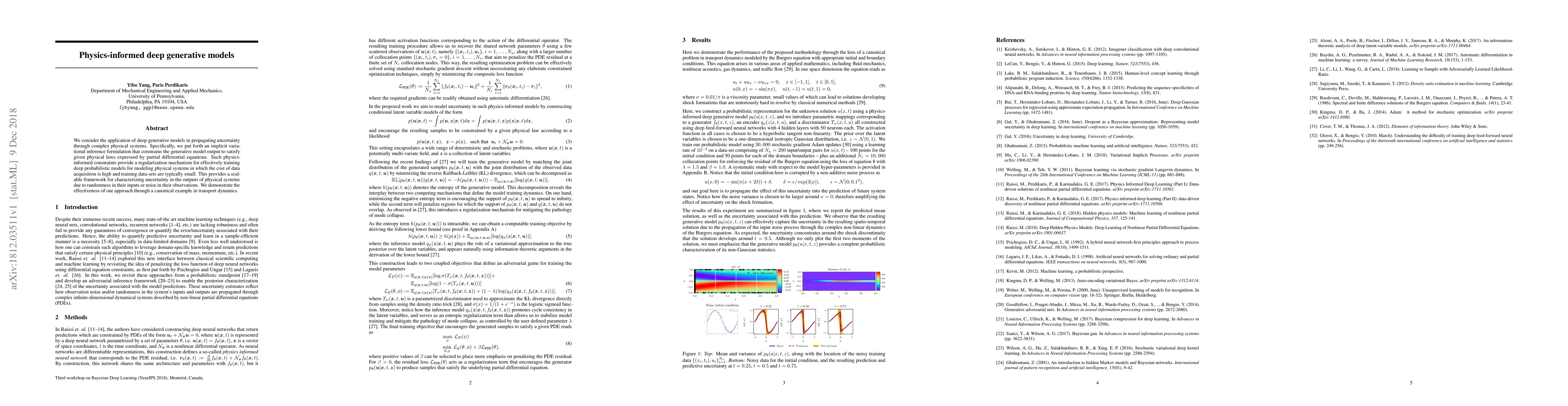 We consider the application of deep generative models in propagating uncertainty through complex physical systems. Specifically, we put forth an implicit variational inference formulation that constrains the generative model output to satisfy given physical laws expressed by partial differential equations. Such physics-informed constraints provide a regularization mechanism for effectively training deep probabilistic models for modeling physical systems in which the cost of data acquisition is high and training data-sets are typically small. This provides a scalable framework for characterizing uncertainty in the outputs of physical systems due to randomness in their inputs or noise in their observations. We demonstrate the effectiveness of our approach through a canonical example in transport dynamics.
