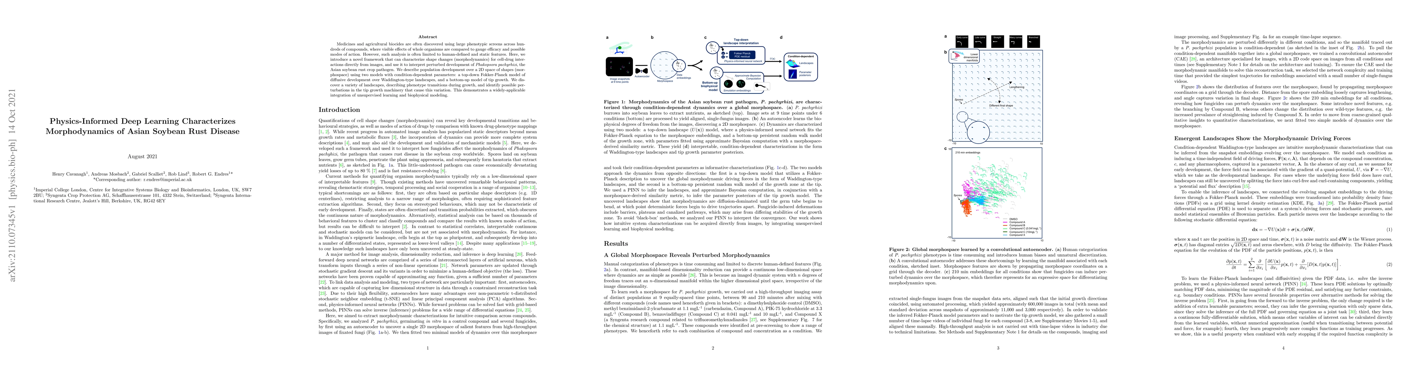 This research introduces a novel deep learning framework to analyze shape changes (morphodynamics) in cell-drug interactions, specifically for the Asian soybean rust pathogen Phakopsora pachyrhizi. The method combines unsupervised learning with biophysical modeling, revealing diverse development landscapes and potential disruptions in the tip growth machinery.