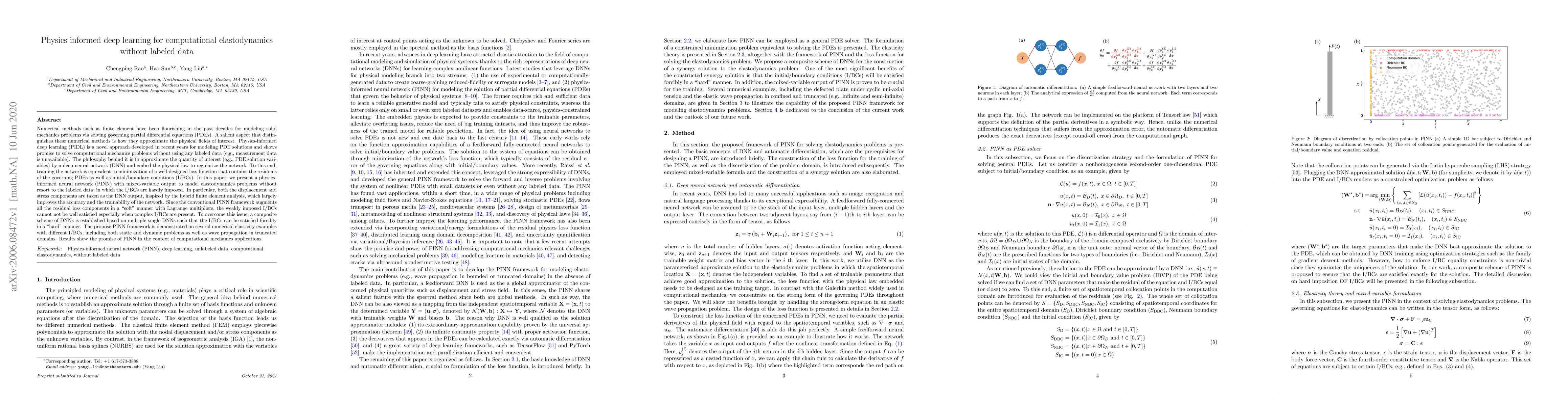 This paper introduces a physics-informed neural network (PINN) for modeling elastodynamics problems without labeled data, embedding physical laws to regularize the network. The approach uses mixed-variable output to improve accuracy, and a composite scheme for hard imposition of initial/boundary conditions to overcome limitations in conventional PINN frameworks.
