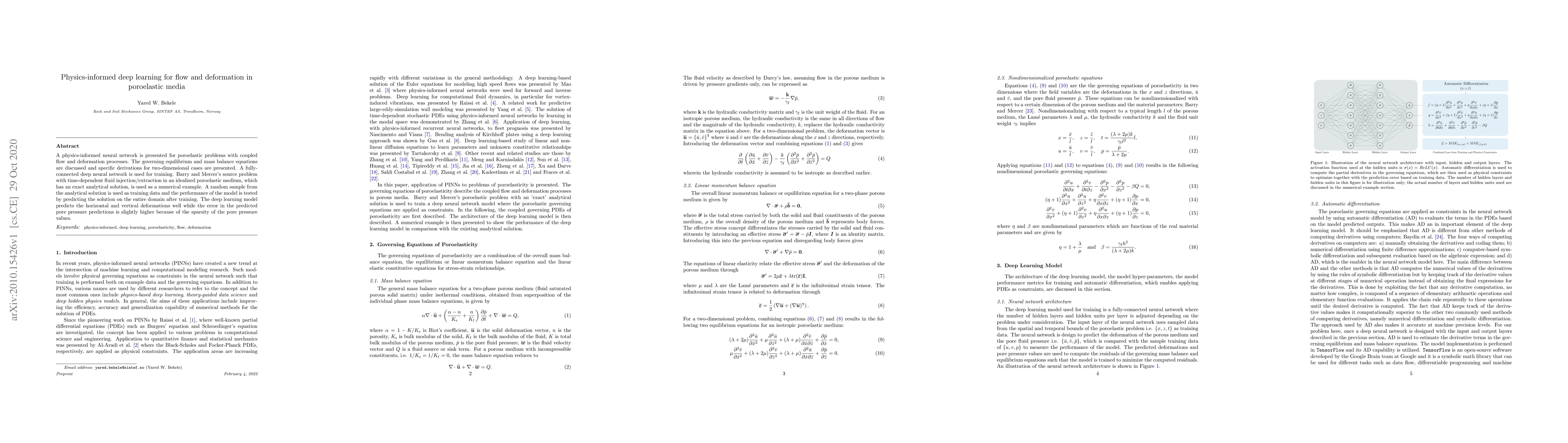 This paper introduces a physics-informed neural network to model coupled flow and deformation in poroelastic media, demonstrating its effectiveness using Barry and Mercer's source problem with fluid injection/extraction. The model accurately predicts deformations but shows slightly higher error in pore pressure predictions due to data sparsity.