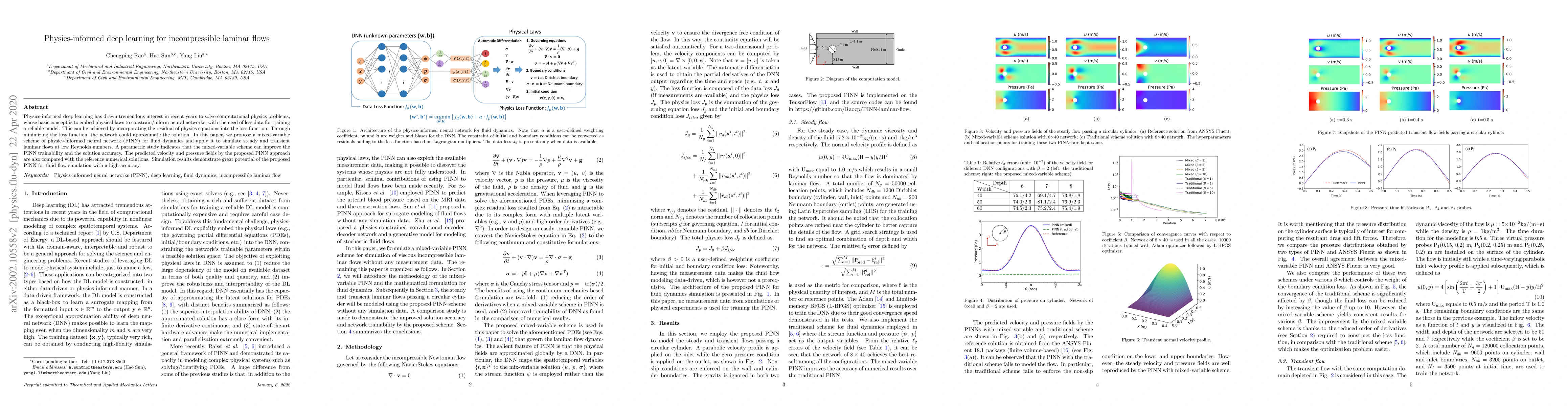 This paper proposes a mixed-variable scheme of physics-informed neural networks (PINN) to simulate incompressible laminar flows, demonstrating improved trainability and accuracy. The method incorporates physical laws into the loss function, showing high potential for fluid flow simulations at low Reynolds numbers.