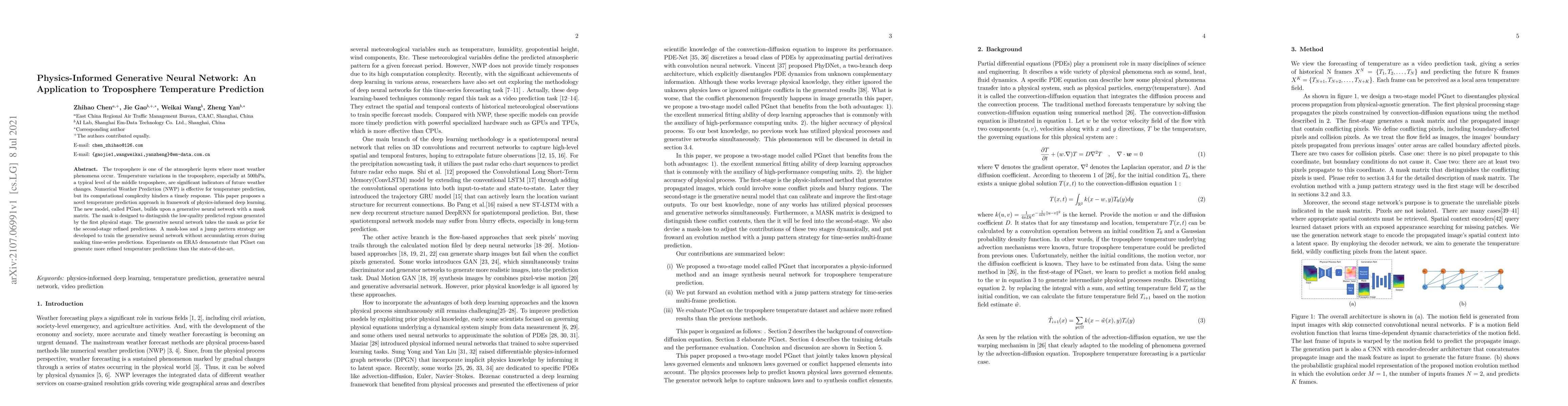 The research proposes PGnet, a physics-informed generative neural network for troposphere temperature prediction. It combines a generative neural network with a mask matrix, distinguishing low-quality predicted regions via a physical stage. A mask-loss and jump pattern strategy are developed to train the generative network, avoiding error accumulation in time-series predictions.