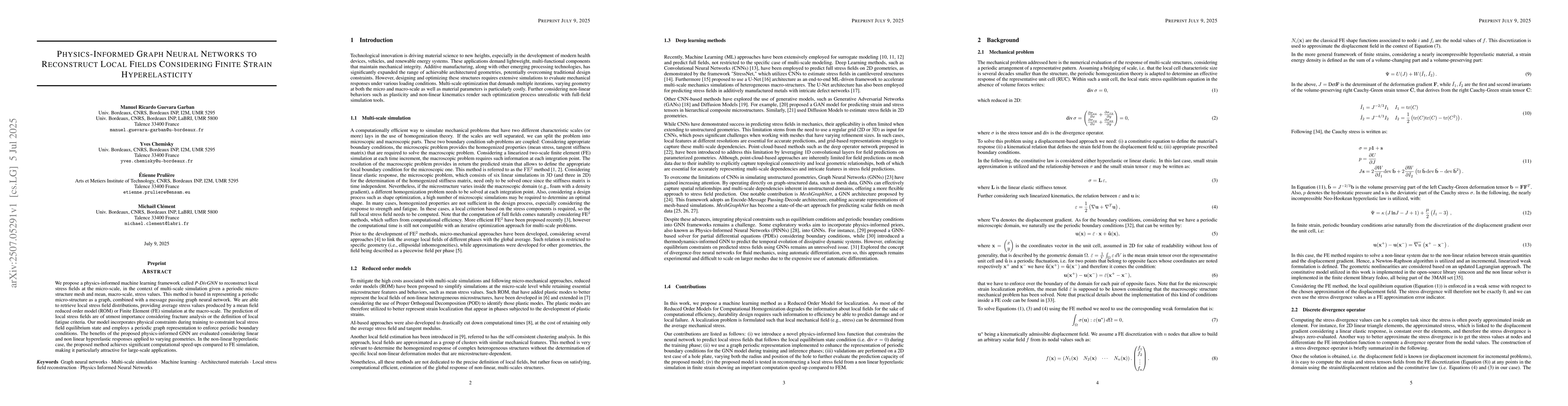 We propose a physics-informed machine learning framework called P-DivGNN to reconstruct local stress fields at the micro-scale, in the context of multi-scale simulation given a periodic micro-structure mesh and mean, macro-scale, stress values. This method is based in representing a periodic micro-structure as a graph, combined with a message passing graph neural network. We are able to retrieve local stress field distributions, providing average stress values produced by a mean field reduced order model (ROM) or Finite Element (FE) simulation at the macro-scale. The prediction of local stress fields are of utmost importance considering fracture analysis or the definition of local fatigue criteria. Our model incorporates physical constraints during training to constraint local stress field equilibrium state and employs a periodic graph representation to enforce periodic boundary conditions. The benefits of the proposed physics-informed GNN are evaluated considering linear and non linear hyperelastic responses applied to varying geometries. In the non-linear hyperelastic case, the proposed method achieves significant computational speed-ups compared to FE simulation, making it particularly attractive for large-scale applications.