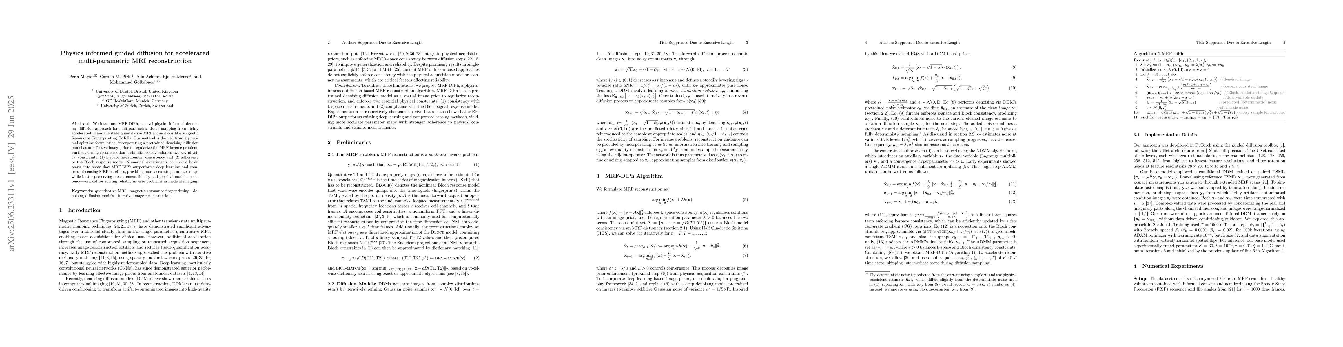 We introduce MRF-DiPh, a novel physics informed denoising diffusion approach for multiparametric tissue mapping from highly accelerated, transient-state quantitative MRI acquisitions like Magnetic Resonance Fingerprinting (MRF). Our method is derived from a proximal splitting formulation, incorporating a pretrained denoising diffusion model as an effective image prior to regularize the MRF inverse problem. Further, during reconstruction it simultaneously enforces two key physical constraints: (1) k-space measurement consistency and (2) adherence to the Bloch response model. Numerical experiments on in-vivo brain scans data show that MRF-DiPh outperforms deep learning and compressed sensing MRF baselines, providing more accurate parameter maps while better preserving measurement fidelity and physical model consistency-critical for solving reliably inverse problems in medical imaging.