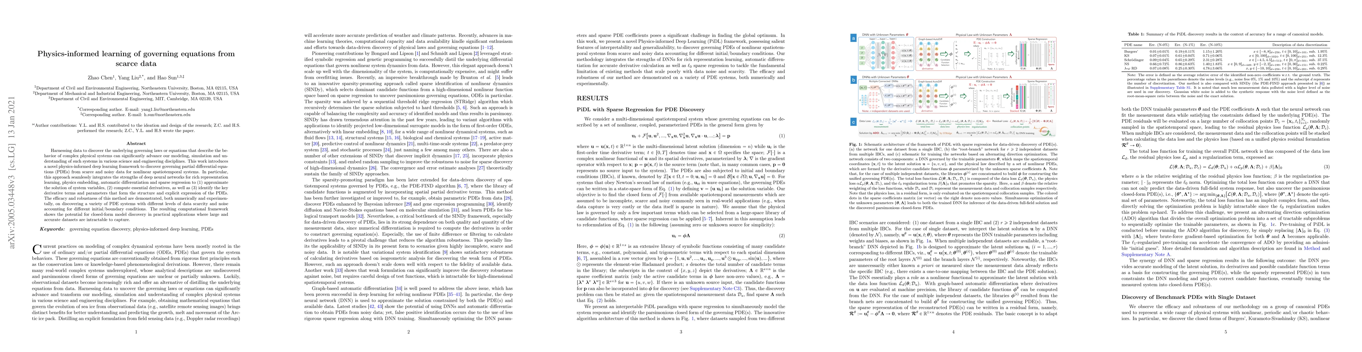 This paper proposes a novel physics-informed deep learning framework to discover governing partial differential equations from scarce and noisy data. The method integrates deep learning, physics embedding, and sparse regression to identify key derivative terms and parameters, demonstrating efficacy on various PDE systems.