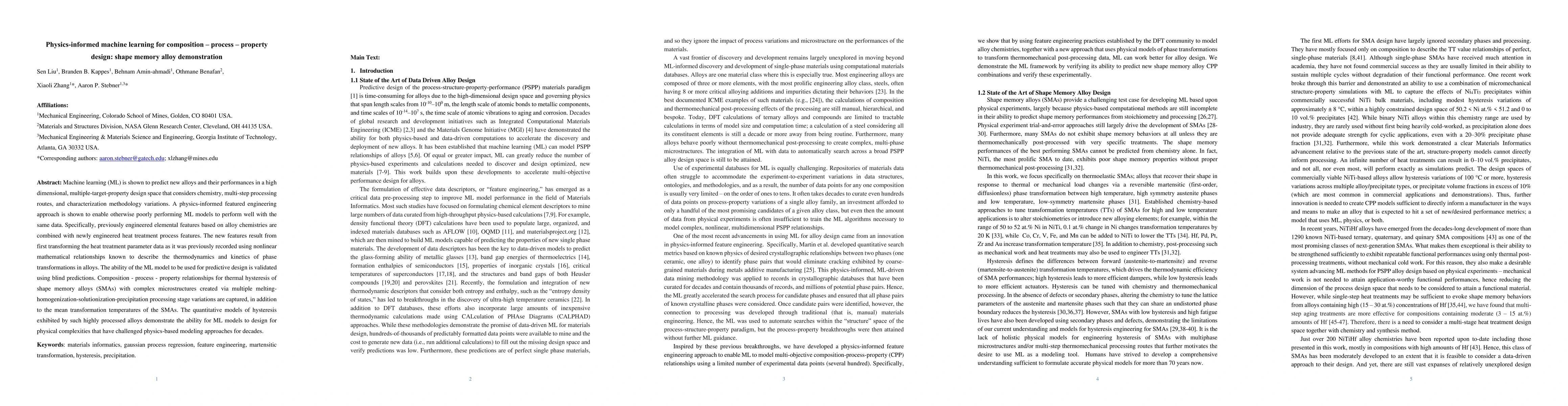 This paper demonstrates the use of physics-informed machine learning to predict new shape memory alloys and their properties, integrating chemistry, processing routes, and characterization variations. The approach enhances model performance by incorporating engineered features based on thermodynamics and kinetics of phase transformations, validated through blind predictions.