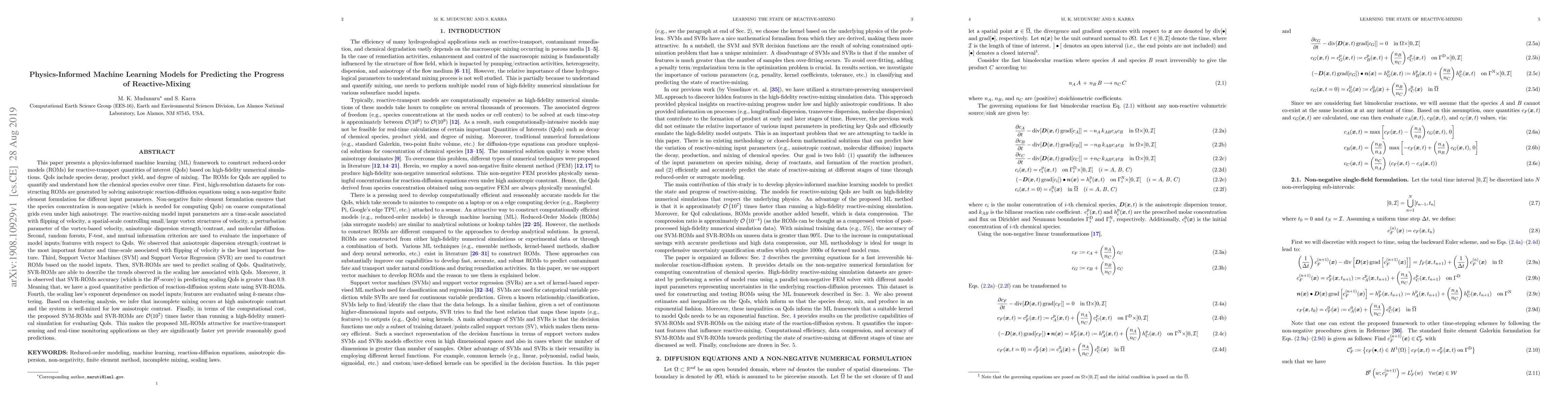 This paper presents a physics-informed machine learning (ML) framework to construct reduced-order models (ROMs) for reactive-transport quantities of interest (QoIs) based on high-fidelity numerical simulations. QoIs include species decay, product yield, and degree of mixing. The ROMs for QoIs are applied to quantify and understand how the chemical species evolve over time. First, high-resolution datasets for constructing ROMs are generated by solving anisotropic reaction-diffusion equations using a non-negative finite element formulation for different input parameters. Non-negative finite element formulation ensures that the species concentration is non-negative (which is needed for computing QoIs) on coarse computational grids even under high anisotropy. The reactive-mixing model input parameters are a time-scale associated with flipping of velocity, a spatial-scale controlling small/large vortex structures of velocity, a perturbation parameter of the vortex-based velocity, anisotropic dispersion strength/contrast, and molecular diffusion. Second, random forests, F-test, and mutual information criterion are used to evaluate the importance of model inputs/features with respect to QoIs. Third, Support Vector Machines (SVM) and Support Vector Regression (SVR) are used to construct ROMs based on the model inputs. Then, SVR-ROMs are used to predict scaling of QoIs. Qualitatively, SVR-ROMs are able to describe the trends observed in the scaling law associated with QoIs. Fourth, the scaling law's exponent dependence on model inputs/features are evaluated using $k$-means clustering. Finally, in terms of the computational cost, the proposed SVM-ROMs and SVR-ROMs are $\mathcal{O}(10^7)$ times faster than running a high-fidelity numerical simulation for evaluating QoIs.