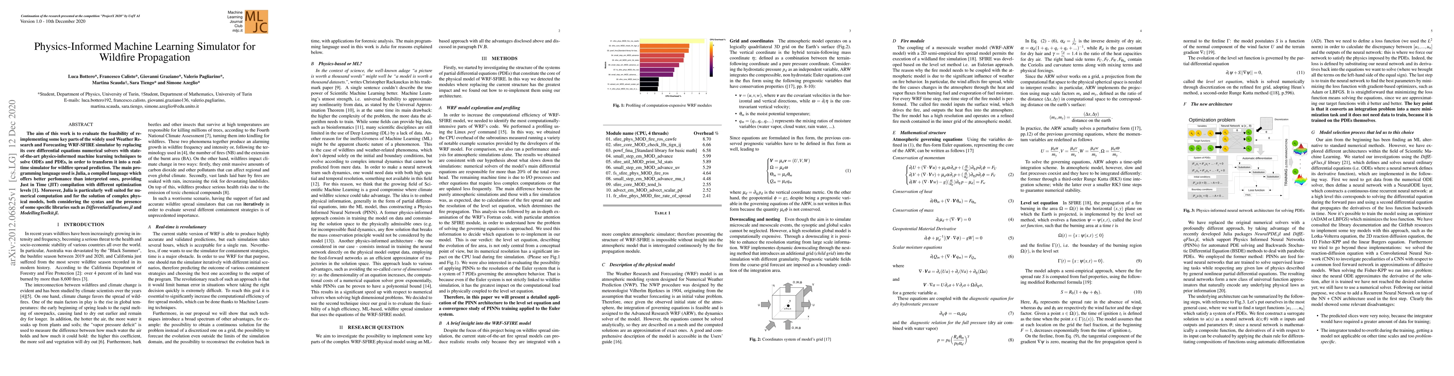 The aim of this work is to evaluate the feasibility of re-implementing some key parts of the widely used Weather Research and Forecasting WRF-SFIRE simulator by replacing its core differential equations numerical solvers with state-of-the-art physics-informed machine learning techniques to solve ODEs and PDEs, in order to transform it into a real-time simulator for wildfire spread prediction. The main programming language used is Julia, a compiled language which offers better perfomance than interpreted ones, providing Just in Time (JIT) compilation with different optimization levels. Moreover, Julia is particularly well suited for numerical computation and for the solution of complex physical models, both considering the syntax and the presence of some specific libraries such as DifferentialEquations.jl and ModellingToolkit.jl.
