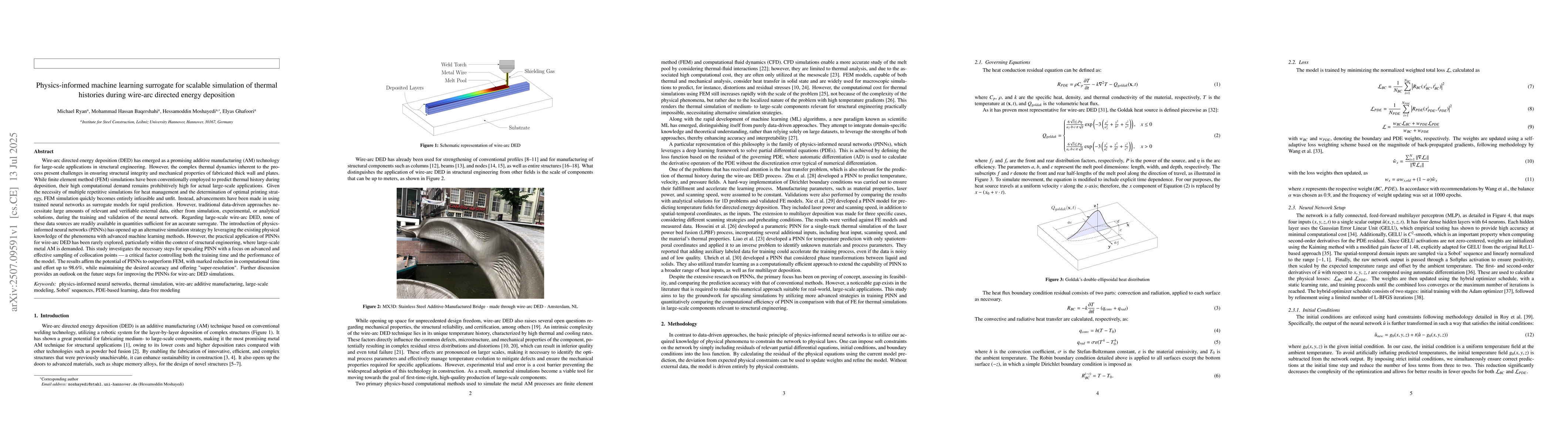 Wire-arc directed energy deposition (DED) has emerged as a promising additive manufacturing (AM) technology for large-scale structural engineering applications. However, the complex thermal dynamics inherent to the process present challenges in ensuring structural integrity and mechanical properties of fabricated thick walls and plates. While finite element method (FEM) simulations have been conventionally employed to predict thermal history during deposition, their computational demand remains prohibitively high for actual large-scale applications. Given the necessity of multiple repetitive simulations for heat management and the determination of an optimal printing strategy, FEM simulation quickly becomes entirely infeasible. Instead, advancements have been made in using trained neural networks as surrogate models for rapid prediction. However, traditional data-driven approaches necessitate large amounts of relevant and verifiable external data, during the training and validation of the neural network. Regarding large-scale wire-arc DED, none of these data sources are readily available in quantities sufficient for an accurate surrogate. The introduction of physics-informed neural networks (PINNs) has opened up an alternative simulation strategy by leveraging the existing physical knowledge of the phenomena with advanced machine learning methods. Despite their theoretical advantages, PINNs have seen limited application in the context of large-scale wire-arc DED for structural engineering. This study investigates the scalability of PINNs, focusing on efficient collocation points sampling, a critical factor controlling both the training time and model performance. Results show PINNs can reduce computational time and effort by up to 98.6%, while maintaining the desired accuracy and offering "super-resolution". Future directions for enhancing PINN performance in metal AM are discussed.