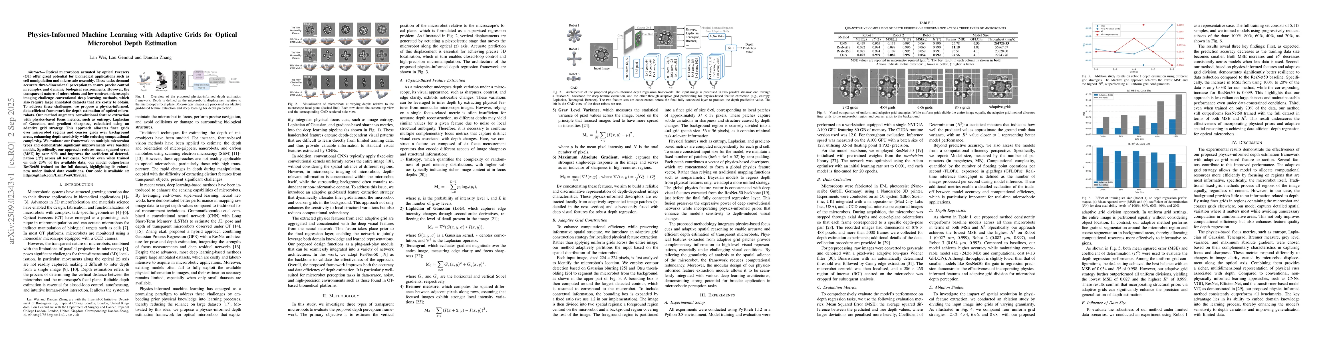 Optical microrobots actuated by optical tweezers (OT) offer great potential for biomedical applications such as cell manipulation and microscale assembly. These tasks demand accurate three-dimensional perception to ensure precise control in complex and dynamic biological environments. However, the transparent nature of microrobots and low-contrast microscopic imaging challenge conventional deep learning methods, which also require large annotated datasets that are costly to obtain. To address these challenges, we propose a physics-informed, data-efficient framework for depth estimation of optical microrobots. Our method augments convolutional feature extraction with physics-based focus metrics, such as entropy, Laplacian of Gaussian, and gradient sharpness, calculated using an adaptive grid strategy. This approach allocates finer grids over microrobot regions and coarser grids over background areas, enhancing depth sensitivity while reducing computational complexity. We evaluate our framework on multiple microrobot types and demonstrate significant improvements over baseline models. Specifically, our approach reduces mean squared error (MSE) by over 60% and improves the coefficient of determination (R^2) across all test cases. Notably, even when trained on only 20% of the available data, our model outperforms ResNet50 trained on the full dataset, highlighting its robustness under limited data conditions. Our code is available at: https://github.com/LannWei/CBS2025.