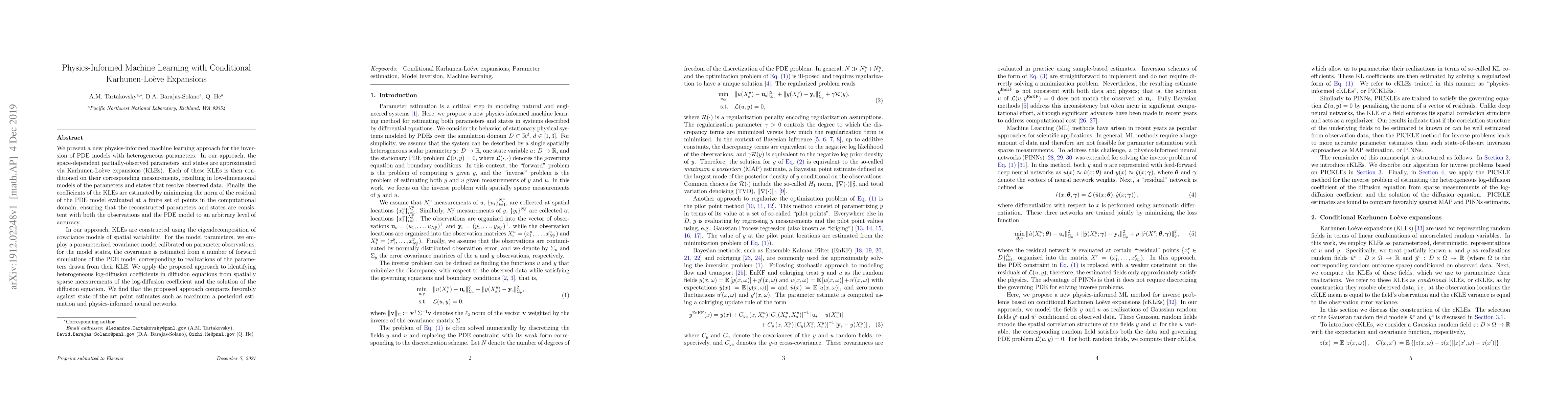 We present a new physics-informed machine learning approach for the inversion of PDE models with heterogeneous parameters. In our approach, the space-dependent partially-observed parameters and states are approximated via Karhunen-Lo\`eve expansions (KLEs). Each of these KLEs is then conditioned on their corresponding measurements, resulting in low-dimensional models of the parameters and states that resolve observed data. Finally, the coefficients of the KLEs are estimated by minimizing the norm of the residual of the PDE model evaluated at a finite set of points in the computational domain, ensuring that the reconstructed parameters and states are consistent with both the observations and the PDE model to an arbitrary level of accuracy. In our approach, KLEs are constructed using the eigendecomposition of covariance models of spatial variability. For the model parameters, we employ a parameterized covariance model calibrated on parameter observations; for the model states, the covariance is estimated from a number of forward simulations of the PDE model corresponding to realizations of the parameters drawn from their KLE. We apply the proposed approach to identifying heterogeneous log-diffusion coefficients in diffusion equations from spatially sparse measurements of the log-diffusion coefficient and the solution of the diffusion equation. We find that the proposed approach compares favorably against state-of-the-art point estimates such as maximum a posteriori estimation and physics-informed neural networks.