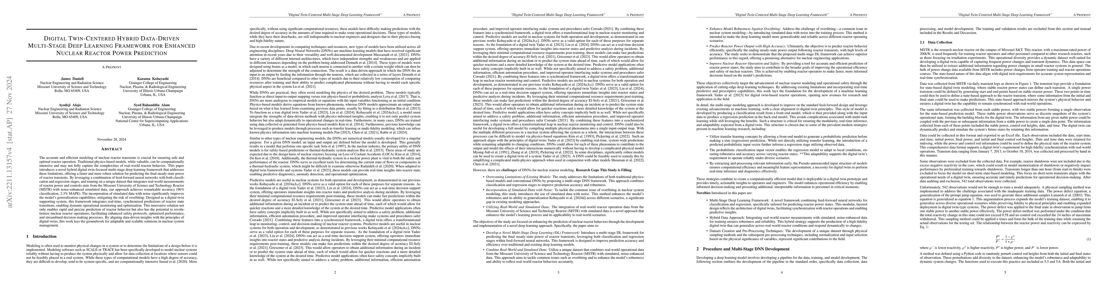 This paper develops a physics-informed multi-stage deep learning framework for predicting nuclear reactor power output in a Digital Twin framework, achieving 96% accuracy in the first stage and 92% in the second stage. The model aims to convert probabilistic classifications into continuous outputs to enhance reliability and analysis.