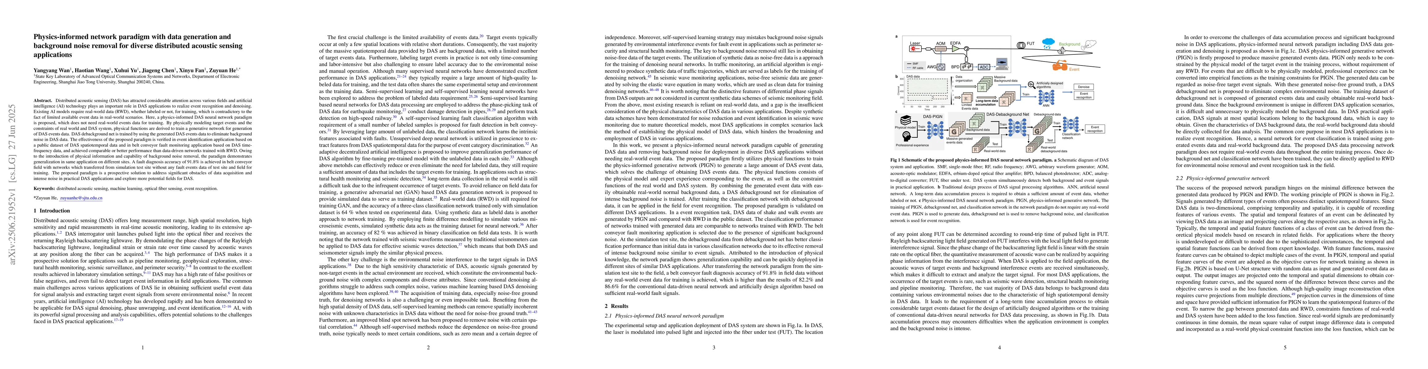 Distributed acoustic sensing (DAS) has attracted considerable attention across various fields and artificial intelligence (AI) technology plays an important role in DAS applications to realize event recognition and denoising. Existing AI models require real-world data (RWD), whether labeled or not, for training, which is contradictory to the fact of limited available event data in real-world scenarios. Here, a physics-informed DAS neural network paradigm is proposed, which does not need real-world events data for training. By physically modeling target events and the constraints of real world and DAS system, physical functions are derived to train a generative network for generation of DAS events data. DAS debackground net is trained by using the generated DAS events data to eliminate background noise in DAS data. The effectiveness of the proposed paradigm is verified in event identification application based on a public dataset of DAS spatiotemporal data and in belt conveyor fault monitoring application based on DAS time-frequency data, and achieved comparable or better performance than data-driven networks trained with RWD. Owing to the introduction of physical information and capability of background noise removal, the paradigm demonstrates generalization in same application on different sites. A fault diagnosis accuracy of 91.8% is achieved in belt conveyor field with networks which transferred from simulation test site without any fault events data of test site and field for training. The proposed paradigm is a prospective solution to address significant obstacles of data acquisition and intense noise in practical DAS applications and explore more potential fields for DAS.