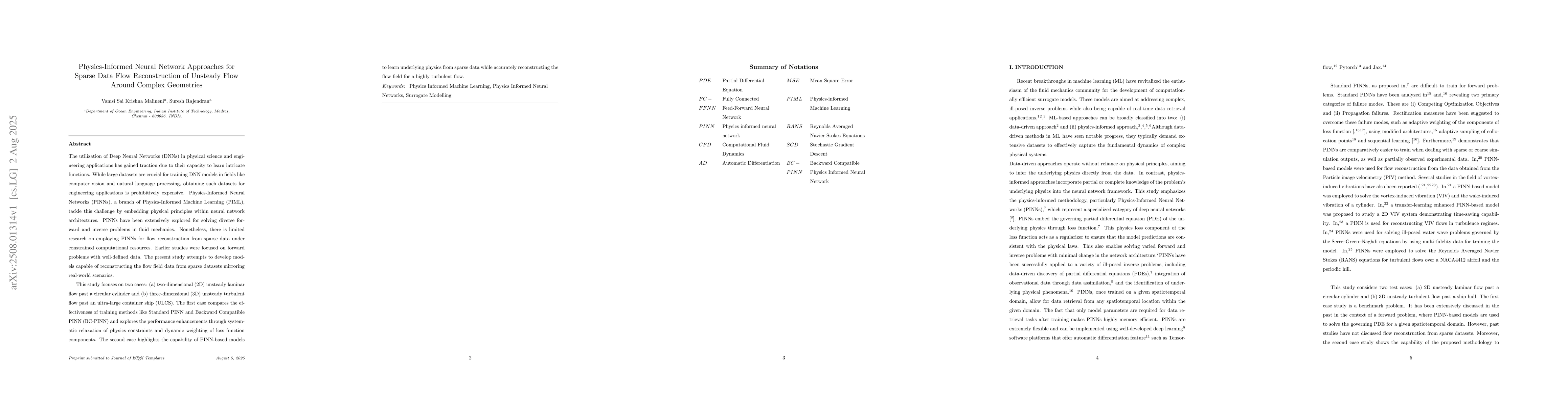 The utilization of Deep Neural Networks (DNNs) in physical science and engineering applications has gained traction due to their capacity to learn intricate functions. While large datasets are crucial for training DNN models in fields like computer vision and natural language processing, obtaining such datasets for engineering applications is prohibitively expensive. Physics-Informed Neural Networks (PINNs), a branch of Physics-Informed Machine Learning (PIML), tackle this challenge by embedding physical principles within neural network architectures. PINNs have been extensively explored for solving diverse forward and inverse problems in fluid mechanics. Nonetheless, there is limited research on employing PINNs for flow reconstruction from sparse data under constrained computational resources. Earlier studies were focused on forward problems with well-defined data. The present study attempts to develop models capable of reconstructing the flow field data from sparse datasets mirroring real-world scenarios. This study focuses on two cases: (a) two-dimensional (2D) unsteady laminar flow past a circular cylinder and (b) three-dimensional (3D) unsteady turbulent flow past an ultra-large container ship (ULCS). The first case compares the effectiveness of training methods like Standard PINN and Backward Compatible PINN (BC-PINN) and explores the performance enhancements through systematic relaxation of physics constraints and dynamic weighting of loss function components. The second case highlights the capability of PINN-based models to learn underlying physics from sparse data while accurately reconstructing the flow field for a highly turbulent flow.