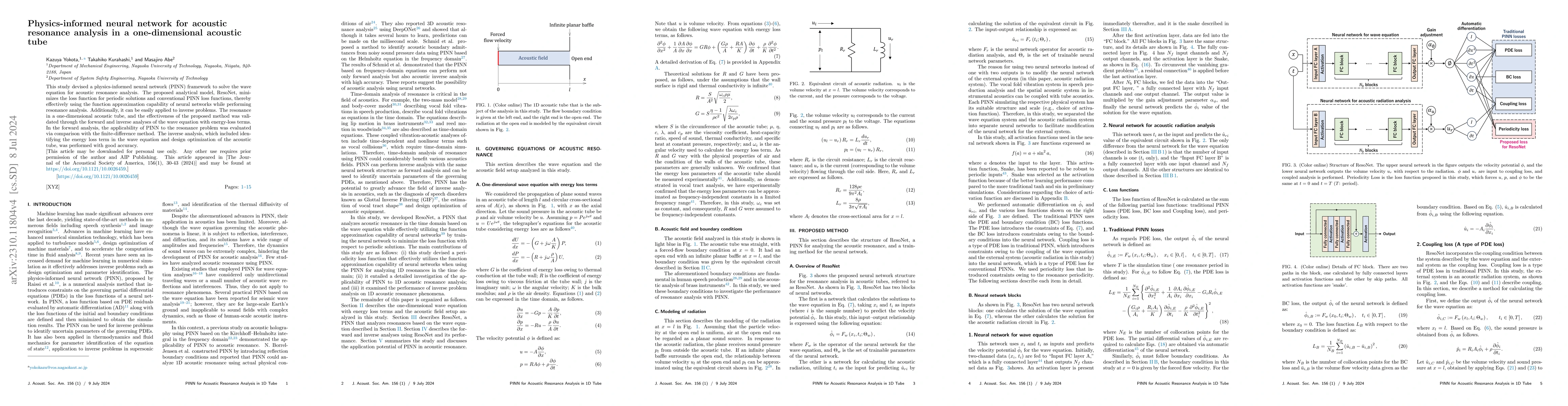 This study introduces a physics-informed neural network (PINN) called ResoNet for analyzing acoustic resonance in a one-dimensional tube, combining periodic solution minimization and conventional PINN losses. The method's accuracy is validated via both forward and inverse analyses, demonstrating effective application to resonance and inverse problems.