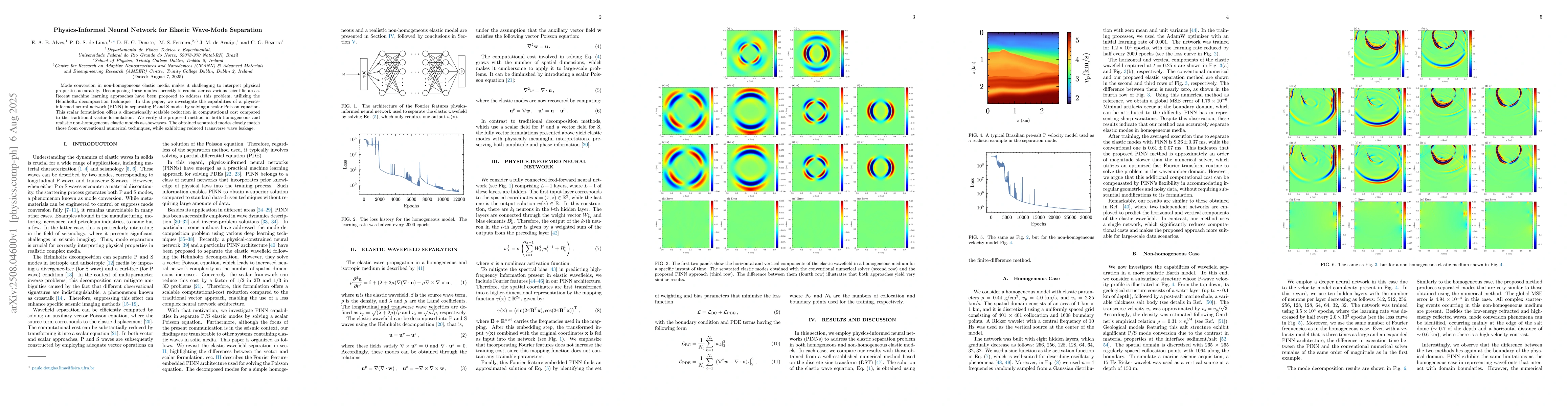 Mode conversion in non-homogeneous elastic media makes it challenging to interpret physical properties accurately. Decomposing these modes correctly is crucial across various scientific areas. Recent machine learning approaches have been proposed to address this problem, utilizing the Helmholtz decomposition technique. In this paper, we investigate the capabilities of a physics-informed neural network (PINN) in separating P and S modes by solving a scalar Poisson equation. This scalar formulation offers a dimensionally scalable reduction in computational cost compared to the traditional vector formulation. We verify the proposed method in both homogeneous and realistic non-homogeneous elastic models as showcases. The obtained separated modes closely match those from conventional numerical techniques, while exhibiting reduced transverse wave leakage.