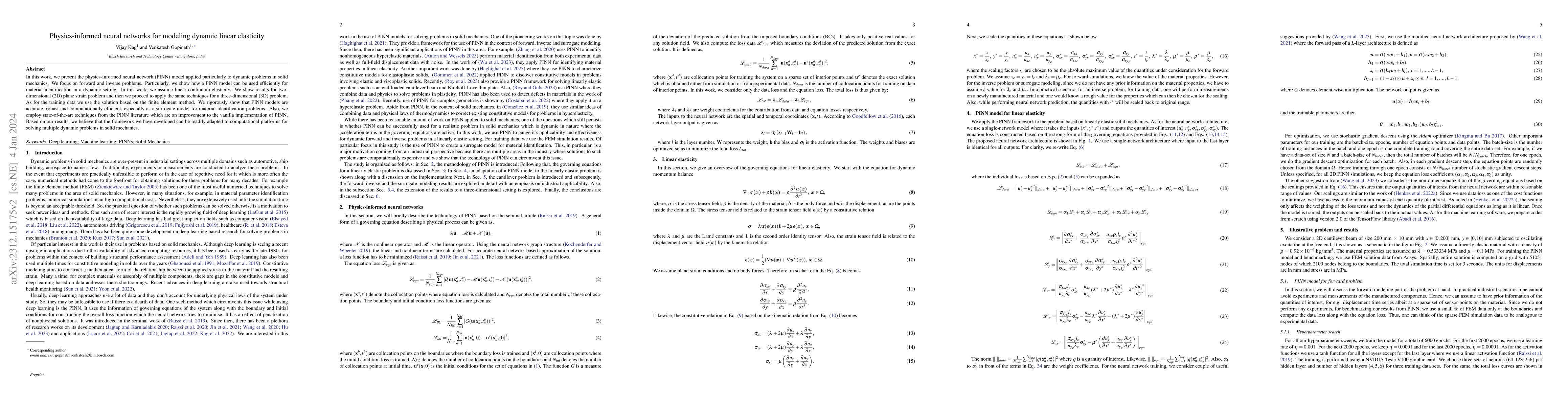 This paper introduces a physics-informed neural network (PINN) model for dynamic linear elasticity problems in solid mechanics, demonstrating its efficiency for forward and inverse problems, particularly material identification. The authors show that PINN models are accurate and robust, using finite element method solutions as training data, and apply the method to both 2D and 3D problems.