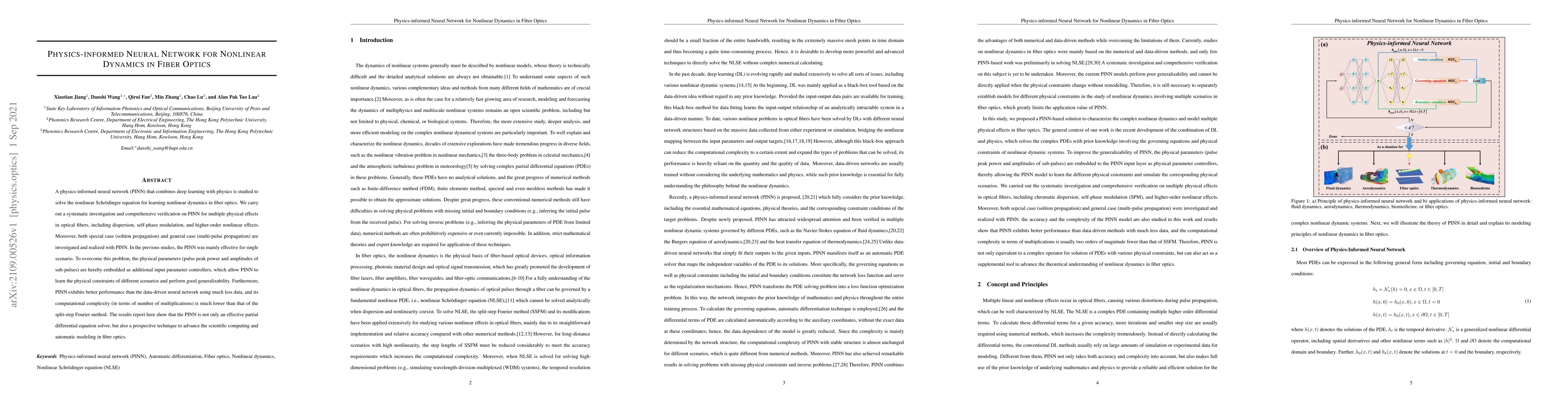A physics-informed neural network (PINN) is used to solve nonlinear dynamics in fiber optics with improved performance compared to traditional methods, enabling better generalizability and efficiency.