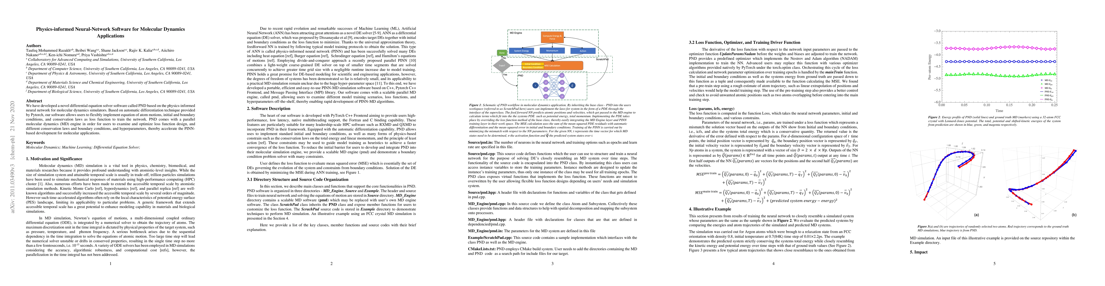 We have developed a novel differential equation solver software called PND based on the physics-informed neural network for molecular dynamics simulators. Based on automatic differentiation technique provided by Pytorch, our software allows users to flexibly implement equation of atom motions, initial and boundary conditions, and conservation laws as loss function to train the network. PND comes with a parallel molecular dynamics (MD) engine in order for users to examine and optimize loss function design, and different conservation laws and boundary conditions, and hyperparameters, thereby accelerate the PINN-based development for molecular applications.