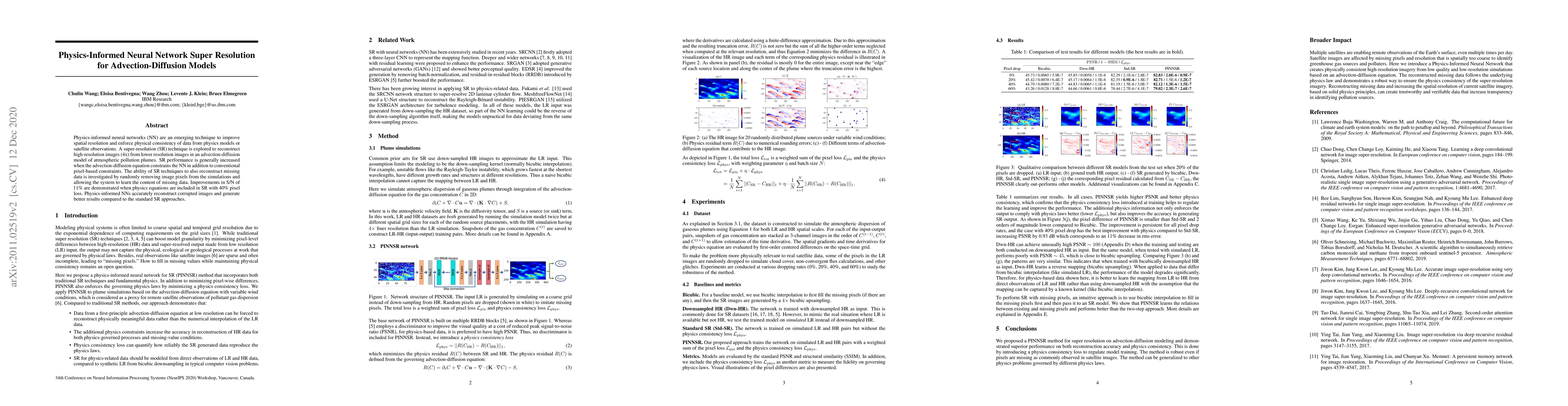 This paper explores physics-informed neural networks for super-resolution in advection-diffusion models, achieving $4\times$ higher resolution from lower resolution images. The inclusion of physics equations in the neural network improves reconstruction accuracy and noise reduction by 11% compared to standard methods.