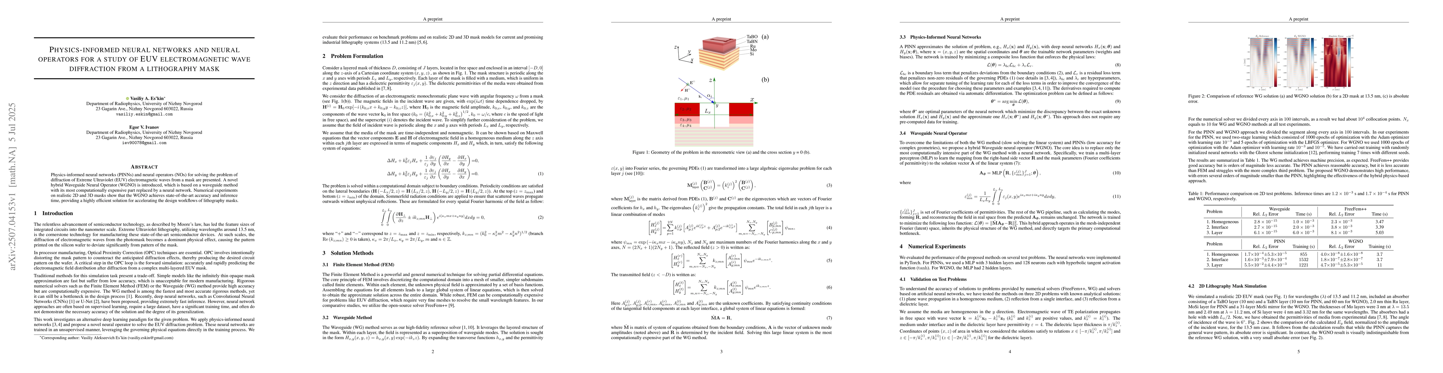 Physics-informed neural networks (PINNs) and neural operators (NOs) for solving the problem of diffraction of Extreme Ultraviolet (EUV) electromagnetic waves from a mask are presented. A novel hybrid Waveguide Neural Operator (WGNO) is introduced, which is based on a waveguide method with its most computationally expensive part replaced by a neural network. Numerical experiments on realistic 2D and 3D masks show that the WGNO achieves state-of-the-art accuracy and inference time, providing a highly efficient solution for accelerating the design workflows of lithography masks.