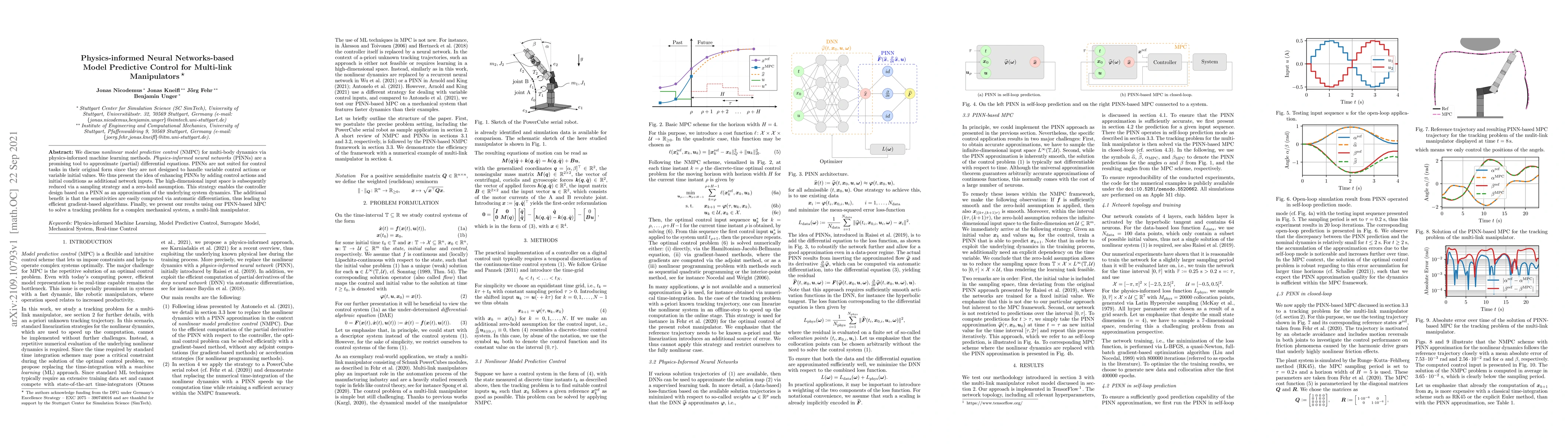 We discuss nonlinear model predictive control (NMPC) for multi-body dynamics via physics-informed machine learning methods. Physics-informed neural networks (PINNs) are a promising tool to approximate (partial) differential equations. PINNs are not suited for control tasks in their original form since they are not designed to handle variable control actions or variable initial values. We thus present the idea of enhancing PINNs by adding control actions and initial conditions as additional network inputs. The high-dimensional input space is subsequently reduced via a sampling strategy and a zero-hold assumption. This strategy enables the controller design based on a PINN as an approximation of the underlying system dynamics. The additional benefit is that the sensitivities are easily computed via automatic differentiation, thus leading to efficient gradient-based algorithms. Finally, we present our results using our PINN-based MPC to solve a tracking problem for a complex mechanical system, a multi-link manipulator.