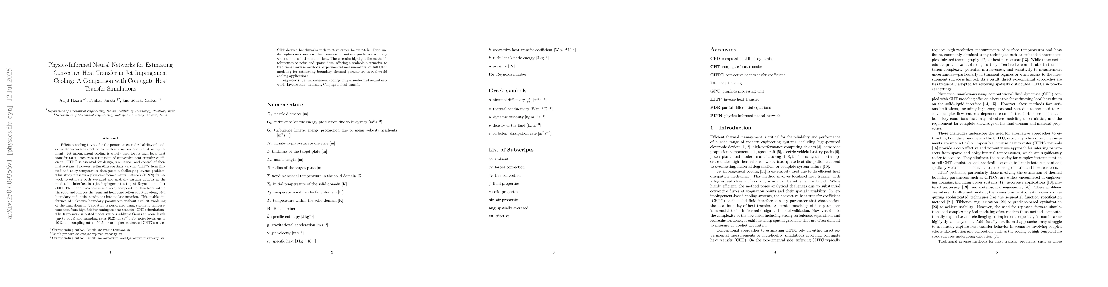 Efficient cooling is vital for the performance and reliability of modern systems such as electronics, nuclear reactors, and industrial equipment. Jet impingement cooling is widely used for its high local heat transfer rates. Accurate estimation of convective heat transfer coefficient (CHTC) is essential for design, simulation, and control of thermal systems. However, estimating spatially varying CHTCs from limited and noisy temperature data poses a challenging inverse problem. This study presents a physics-informed neural network (PINN) framework to estimate both averaged and spatially varying CHTCs at the fluid-solid interface in a jet impingement setup at Reynolds number 5000. The model uses sparse and noisy temperature data from within the solid and embeds the transient heat conduction equation along with boundary and initial conditions into its loss function. This enables inference of unknown boundary parameters without explicit modeling of the fluid domain. Validation is performed using synthetic temperature data from high-fidelity conjugate heat transfer (CHT) simulations. The framework is tested under various additive Gaussian noise levels (up to 30 percent) and sampling rates 0.25 to 4.0 per second. For noise levels up to 10% and sampling rates of 0.5 per second or higher, estimated CHTCs match CHT-derived benchmarks with relative errors below 8 percent. Even under high-noise scenarios, the framework maintains predictive accuracy when time resolution is sufficient. These results highlight the method's robustness to noise and sparse data, offering a scalable alternative to traditional inverse methods, experimental measurements, or full CHT modeling for estimating boundary thermal parameters in real-world cooling applications.