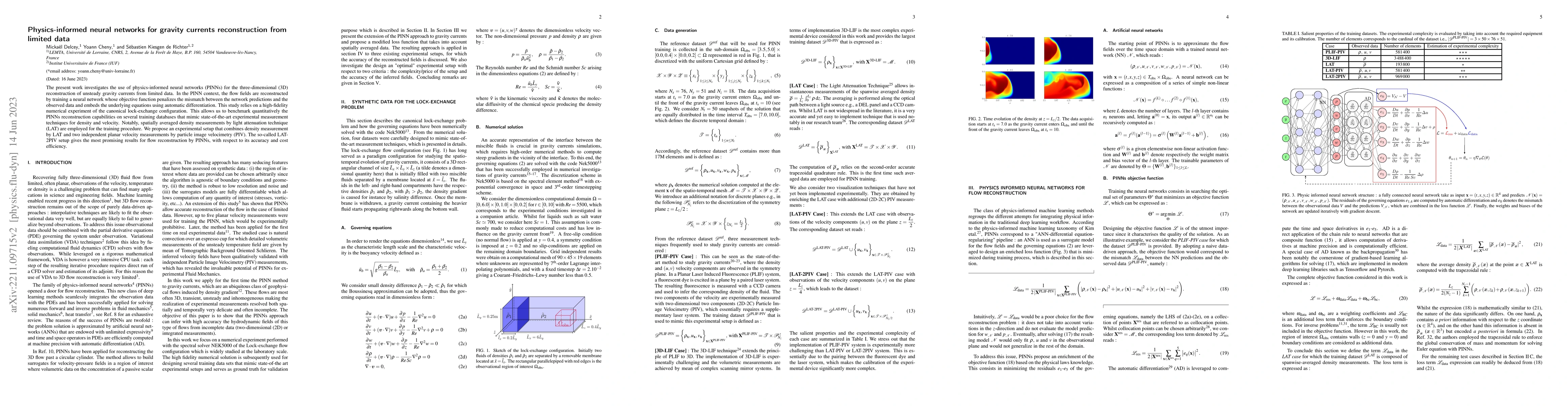 This paper explores the use of physics-informed neural networks (PINNs) to reconstruct 3D unsteady gravity currents from limited data, embedding the underlying equations directly into the neural network. The study benchmarks PINNs against high-fidelity numerical simulations of lock-exchange configurations, proposing an optimal experimental setup based on implementation complexity and reconstruction accuracy.