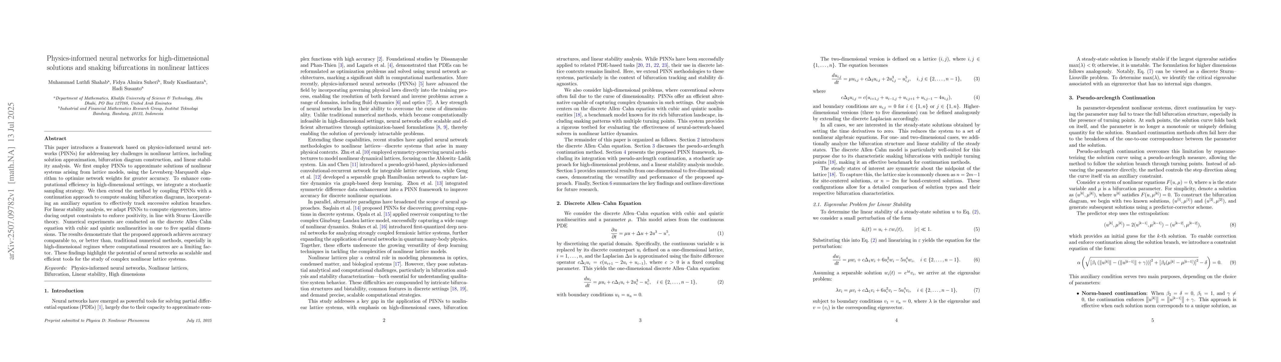 This paper introduces a framework based on physics-informed neural networks (PINNs) for addressing key challenges in nonlinear lattices, including solution approximation, bifurcation diagram construction, and linear stability analysis. We first employ PINNs to approximate solutions of nonlinear systems arising from lattice models, using the Levenberg-Marquardt algorithm to optimize network weights for greater accuracy. To enhance computational efficiency in high-dimensional settings, we integrate a stochastic sampling strategy. We then extend the method by coupling PINNs with a continuation approach to compute snaking bifurcation diagrams, incorporating an auxiliary equation to effectively track successive solution branches. For linear stability analysis, we adapt PINNs to compute eigenvectors, introducing output constraints to enforce positivity, in line with Sturm-Liouville theory. Numerical experiments are conducted on the discrete Allen-Cahn equation with cubic and quintic nonlinearities in one to five spatial dimensions. The results demonstrate that the proposed approach achieves accuracy comparable to, or better than, traditional numerical methods, especially in high-dimensional regimes where computational resources are a limiting factor. These findings highlight the potential of neural networks as scalable and efficient tools for the study of complex nonlinear lattice systems.