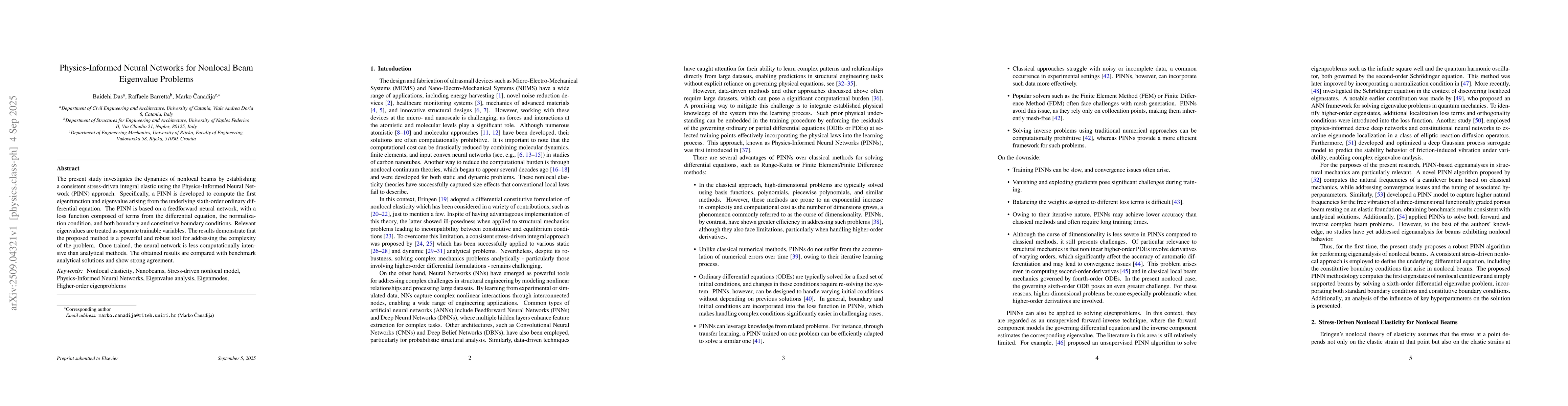 The present study investigates the dynamics of nonlocal beams by establishing a consistent stress-driven integral elastic using the Physics-Informed Neural Network (PINN) approach. Specifically, a PINN is developed to compute the first eigenfunction and eigenvalue arising from the underlying sixth-order ordinary differential equation. The PINN is based on a feedforward neural network, with a loss function composed of terms from the differential equation, the normalization condition, and both boundary and constitutive boundary conditions. Relevant eigenvalues are treated as separate trainable variables. The results demonstrate that the proposed method is a powerful and robust tool for addressing the complexity of the problem. Once trained, the neural network is less computationally intensive than analytical methods. The obtained results are compared with benchmark analytical solutions and show strong agreement.