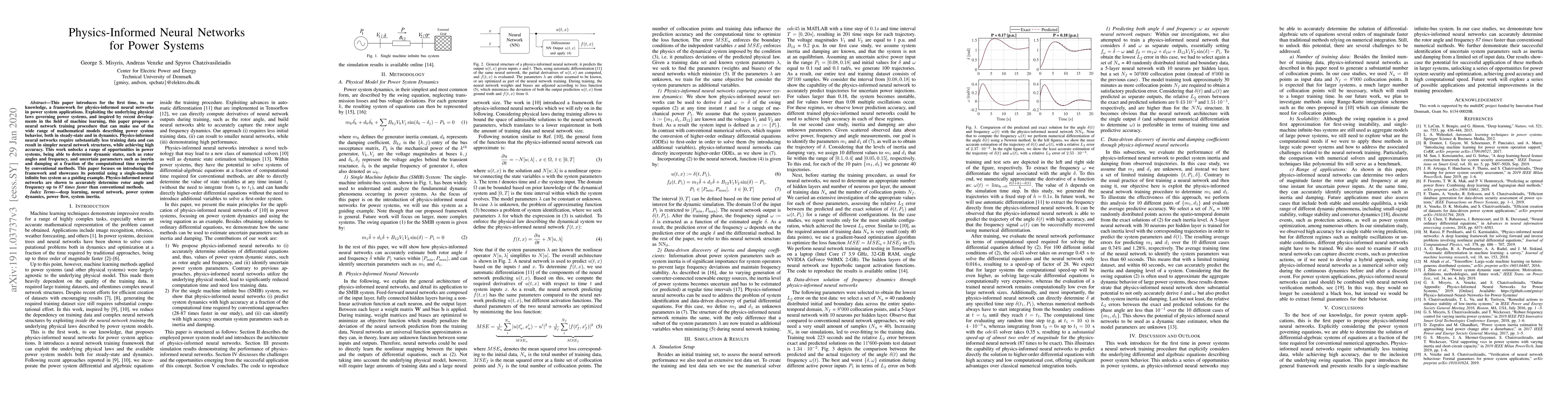 This paper presents a novel framework for physics-informed neural networks in power systems, leveraging underlying physical laws to enhance neural network training and achieve high accuracy with less data. The method is demonstrated to determine dynamic states and uncertain parameters significantly faster than conventional approaches, exemplified through a single-machine infinite bus system.